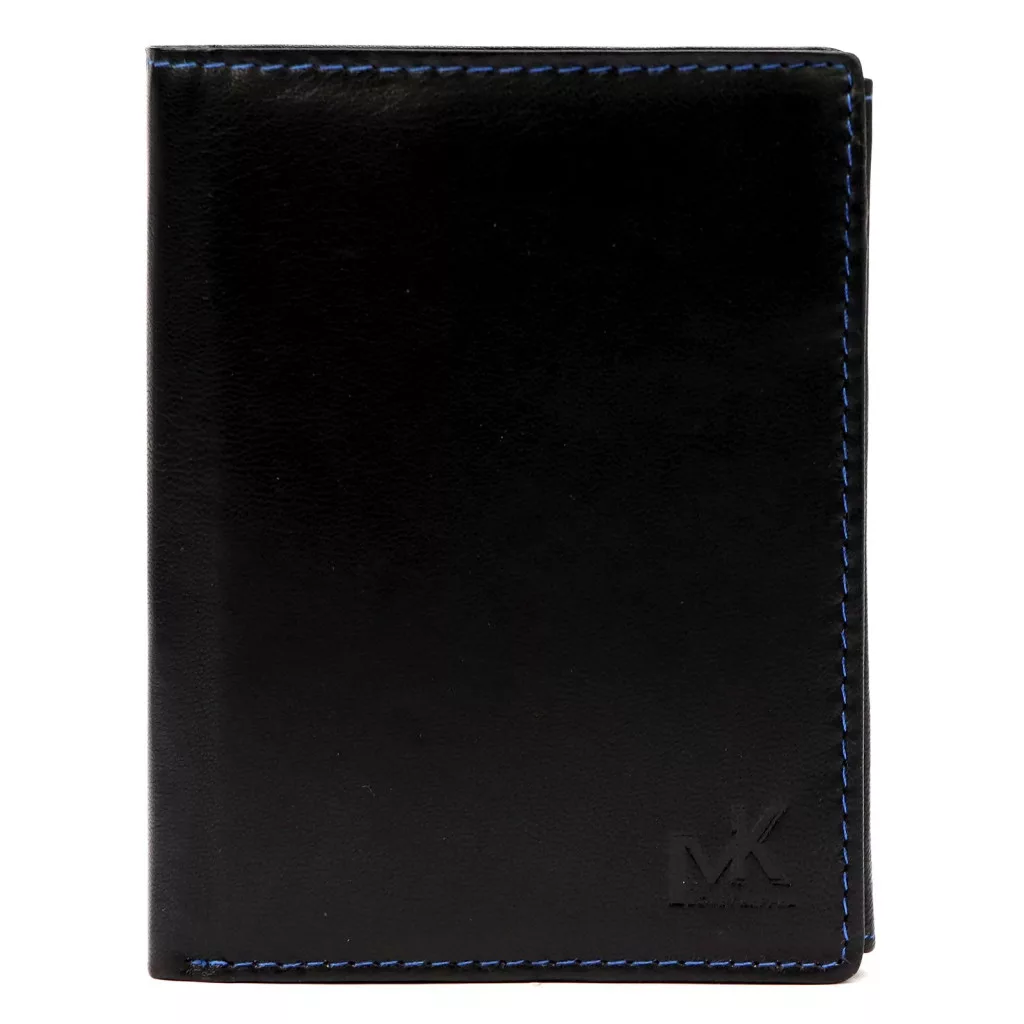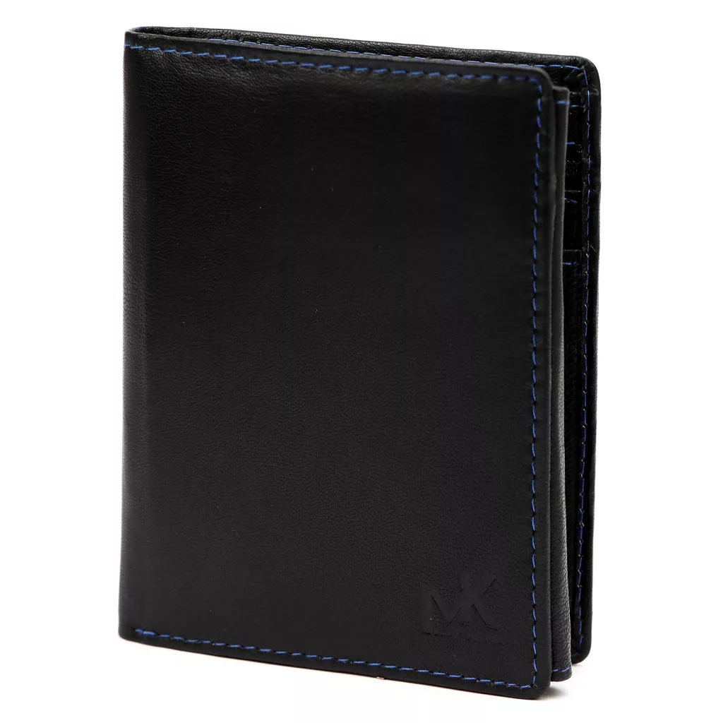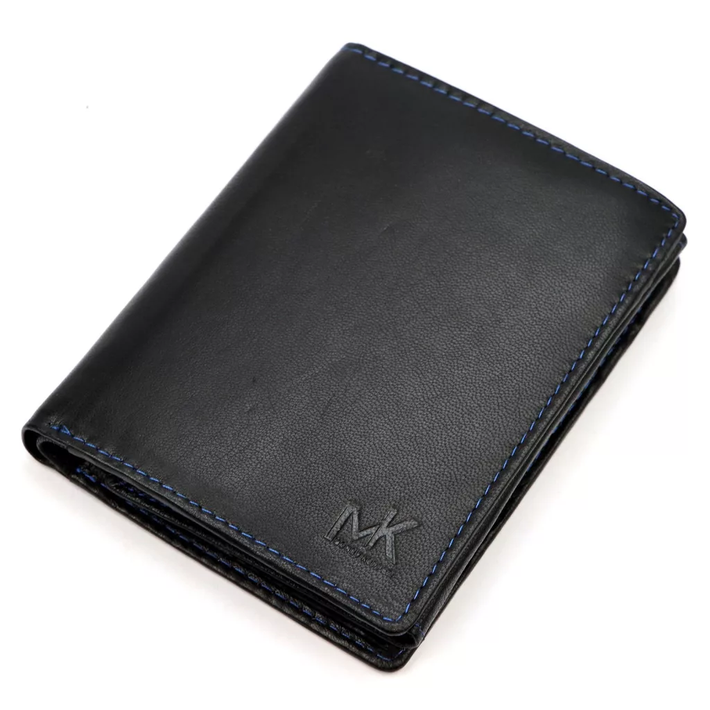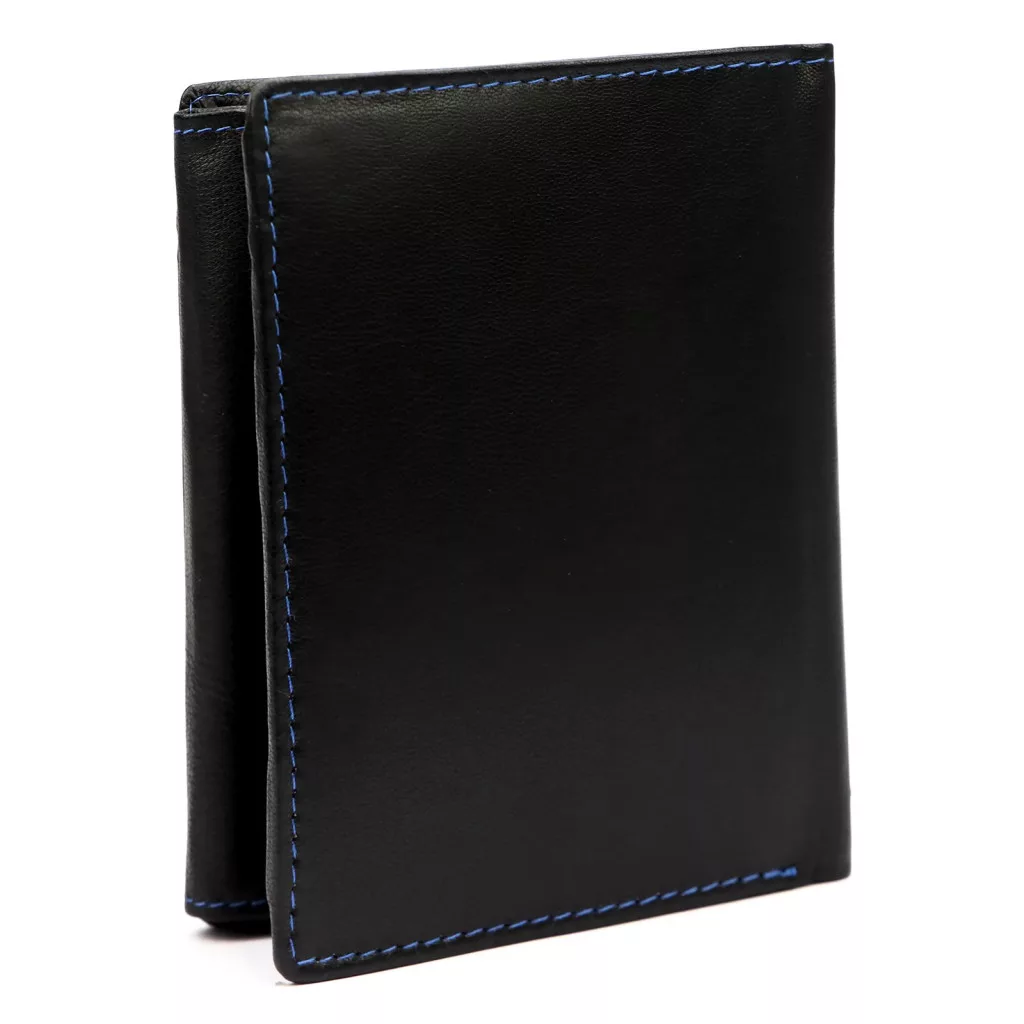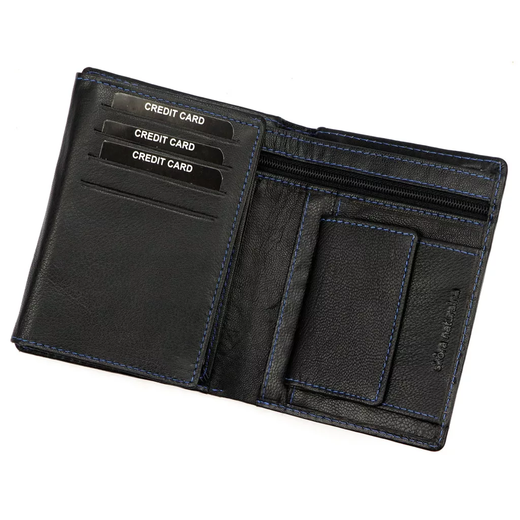 Čierna pánska peňaženka Money Kepper má elegantný, no zároveň výrazný vzhľad vďaka lesklej, mäkkej na dotyk pravej koži, ktorá vyžaruje kvalitu a sofistikovaný štýl. Klasický čierny povrch je zvýraznený modrým ozdobným prešívaním pozdĺž okrajov, ktoré vytvára moderný kontrast s nadčasovým dizajnom. Vzpriamený štýl je praktický a vhodný na každodenné použitie a zároveň poskytuje elegantný vzhľad.