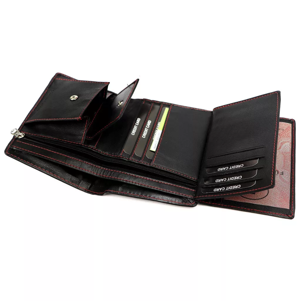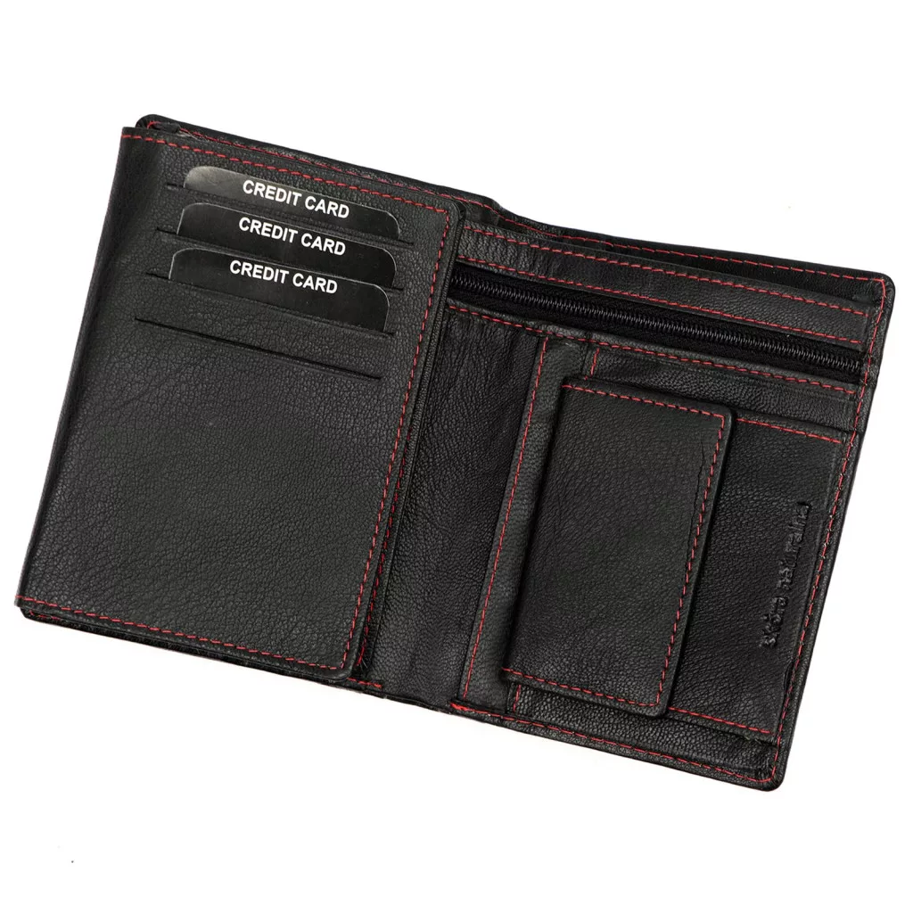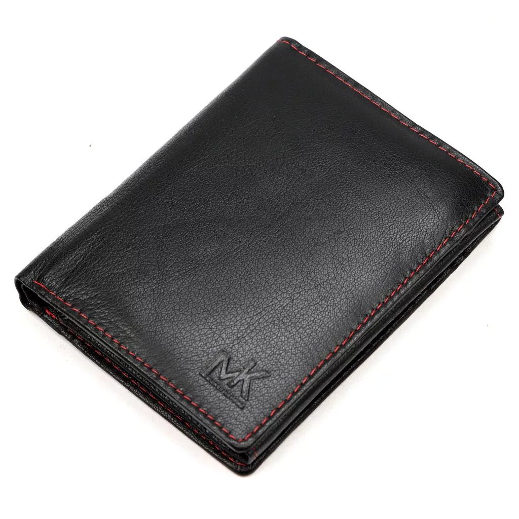 Čierna pánska peňaženka Money Kepper má elegantný a zároveň výrazný vzhľad vďaka lesklej, mäkkej na dotyk pravej koži, ktorá vyžaruje kvalitu a sofistikovaný štýl. Klasický čierny povrch je zvýraznený červeným ozdobným prešívaním pozdĺž okrajov, ktoré vytvára silný a dynamický kontrast s nadčasovým dizajnom. Peňaženka stojaci štýlmá praktický dizajn, vhodný na každodenné použitie, pričom jej vzhľad je elegantný a moderný.
