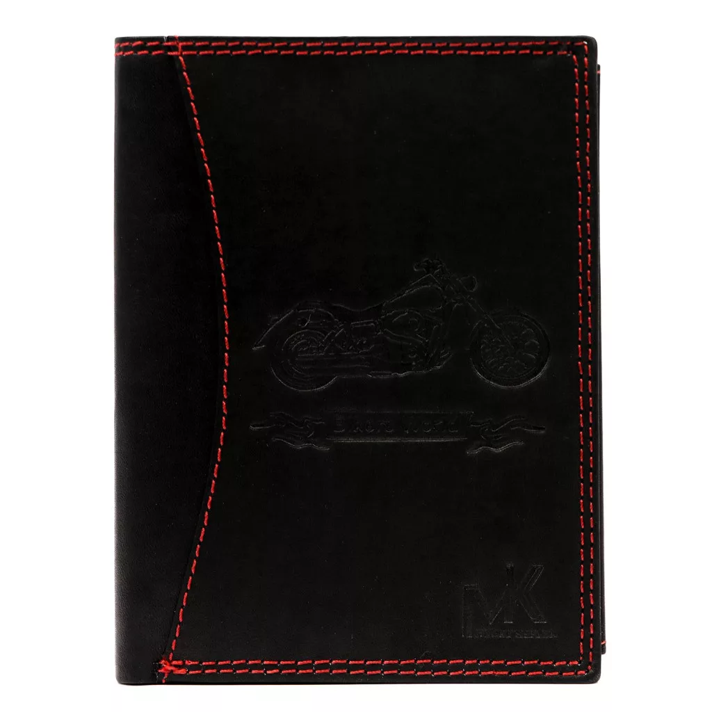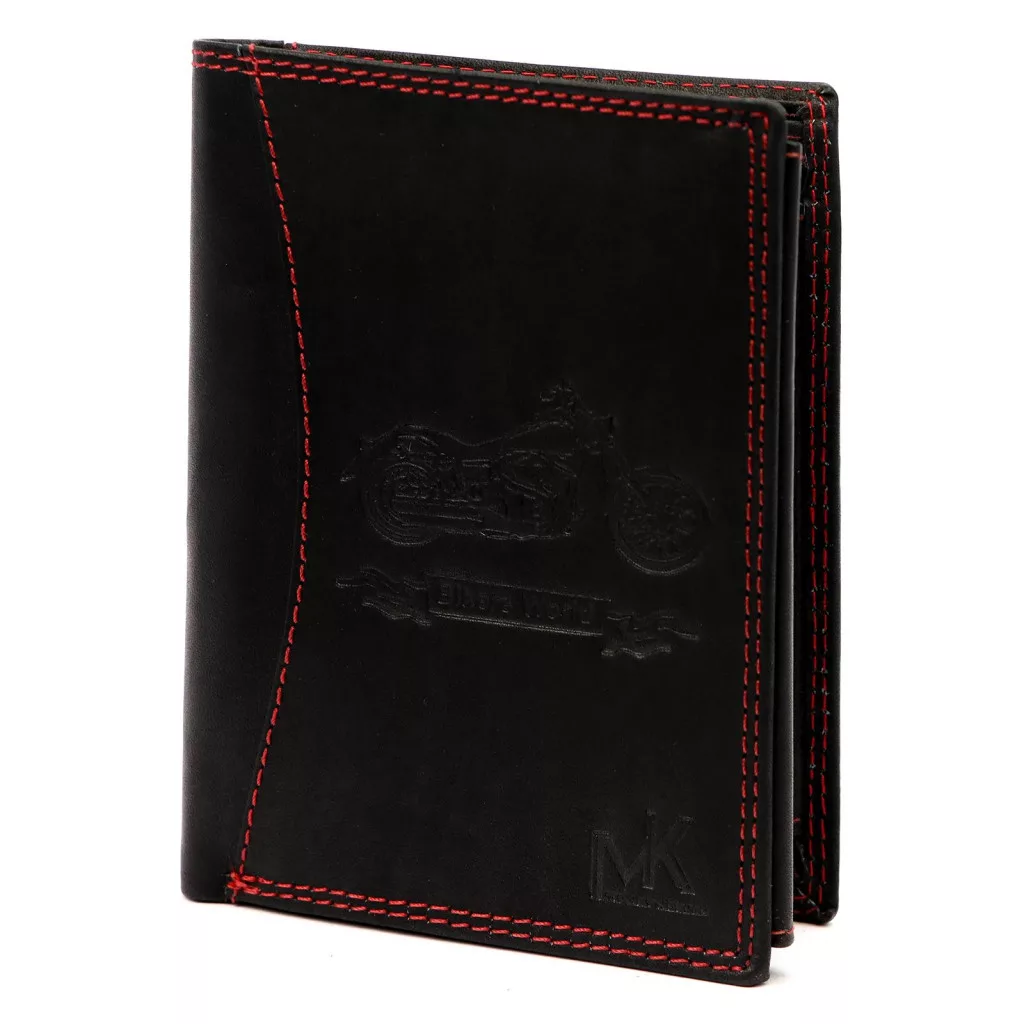 Výrazný a štýlový vzhľad pánskej čiernej hovädzej koženej peňaženky Money Kepperje definovaný výrazným červeným ozdobným prešívaníma motívom motocyklaviditeľným na prednej strane. Kontrastné červené prešívanie dodáva klasickej čiernej koži dynamiku a charakter, zatiaľ čo vzor motocykla vyjadruje pocit slobody a sily. Pravá hovädzia koža je odolná a zároveň mäkká na dotyk, vďaka čomu je peňaženka nielen vizuálne príťažlivá, ale aj spoľahlivým spoločníkom na dlhé obdobie.