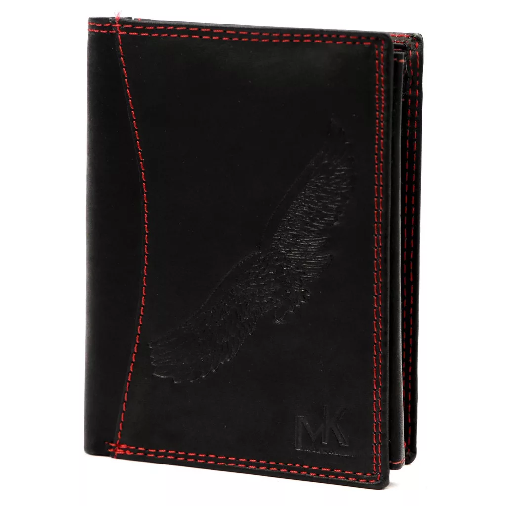 Pánska peňaženka Money Kepperz čiernej hovädzej kožemá svoj osobitý vzhľad vďaka červenému ozdobnému prešívaniu. Motív orla na prednej strane naznačuje silu a odhodlanie, zatiaľ čo kontrastné prešívanie dodáva klasickej čiernej koži športový a elegantný akcent. Pravá hovädzia koža je odolná a príjemná na dotyk, takže si peňaženka dlhodobo zachová svoju kvalitu a štýl.