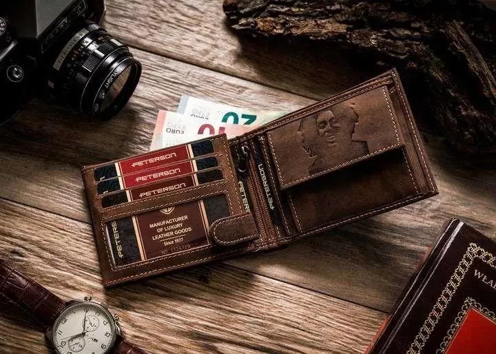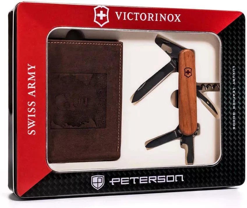 Darčeková sada pánskej hnedej peňaženky a vreckového noža Peterson PTN ZM33 z kože je charakteristická a štýlová kombinácia, ktorá spája kvalitné kožené doplnky s klasickým multifunkčným vreckovým nožom. Prírodná hnedá koža, jedinečné reliéfne detaily a vreckový nôž s drevenou rukoväťou tvoria harmonický celok, vďaka čomu je sada vynikajúcou voľbou ako darček, tak aj na každodenné použitie.
