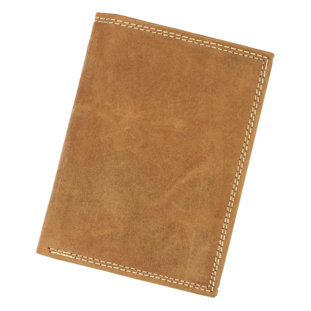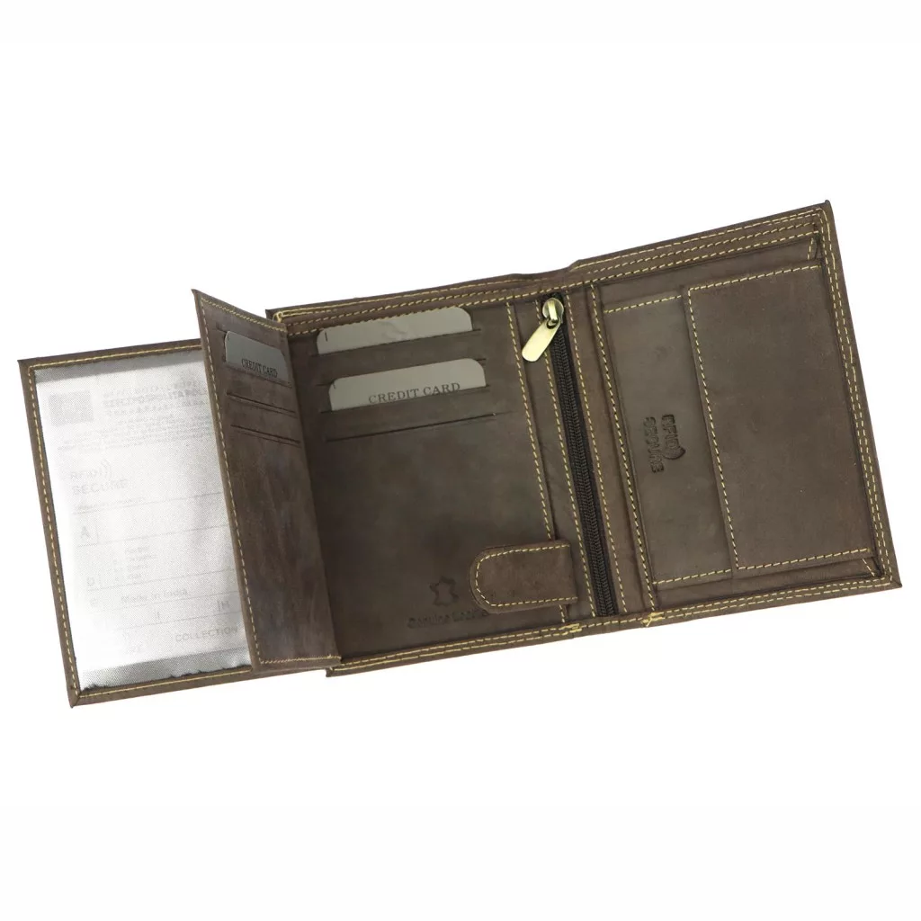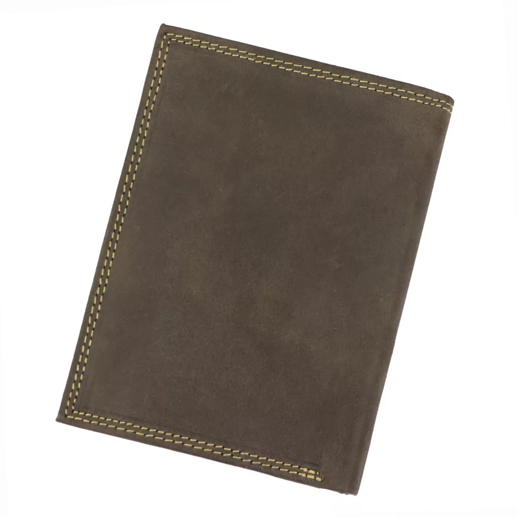 Portfel o orientacji pionowej, wykonany z naturalnej skóry typu nubuk. Posiada dwie przegrody na banknoty, kieszonkę na drobne zapinaną na zatrzask i ukrytą kieszonkę, zapinaną suwakiem. Dwie zakładki, w formie książeczki, zawierają miejsce na dowód rejestracyjny, zdjęcia oraz dziewięć przegródek na karty magnetyczne.
