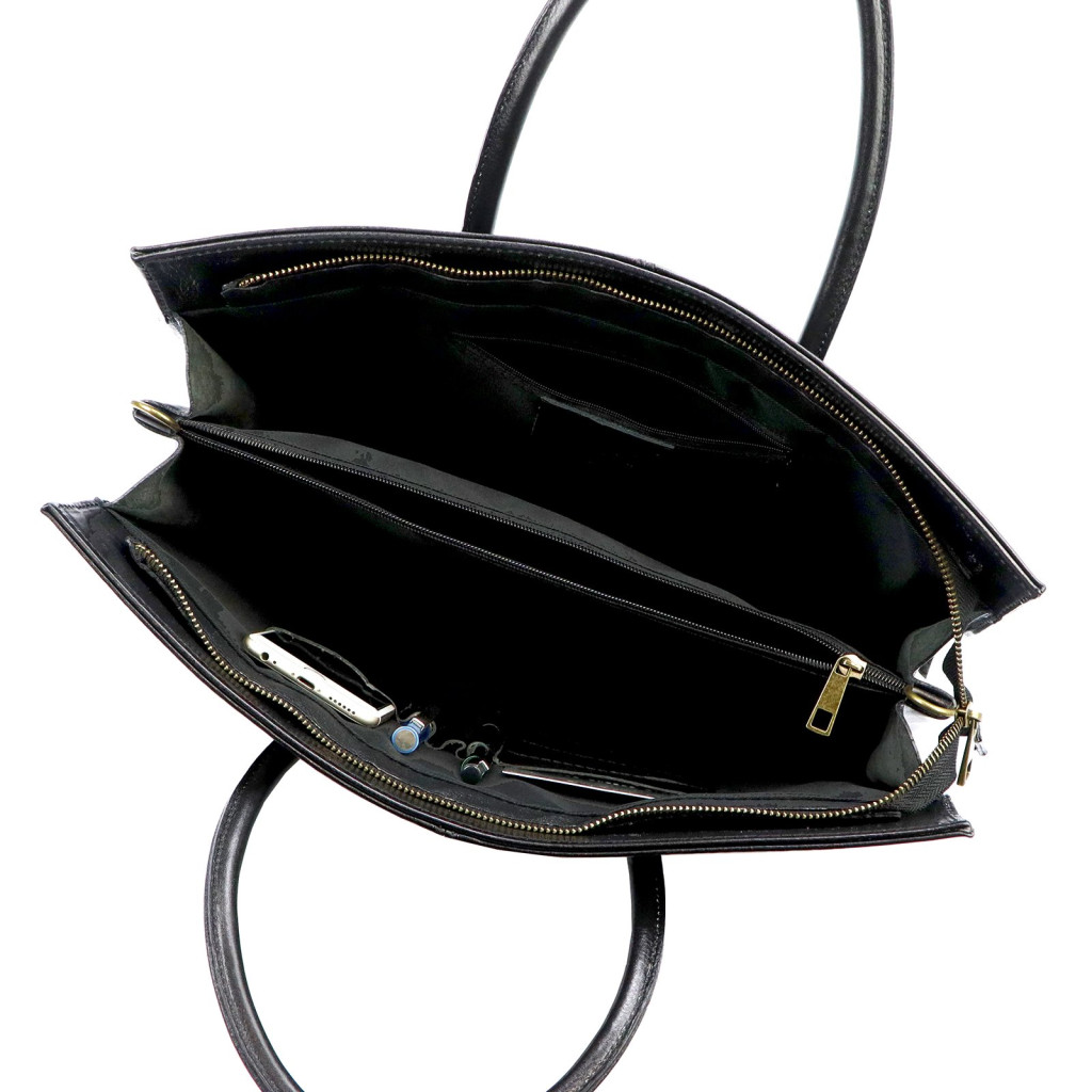 Vnútorný priestor je dobre organizovaný a funkčný. Hlavný priestor na zips má stredové vrecko s deliacou priehradkou, ktoré pomáha oddeliť papiere a dokumenty. Vnútorné vrecko na zips, otvorené vrecko na mobilný telefón a dva držiaky na perá udržiavajú menšie predmety usporiadané. Zakrivené, pevné popruhy na ruku zaisťujú pohodlné nosenie v ruke, zatiaľ čo odnímateľný, nastaviteľný bočný popruh tašky umožňuje nosiť ju na ramene.