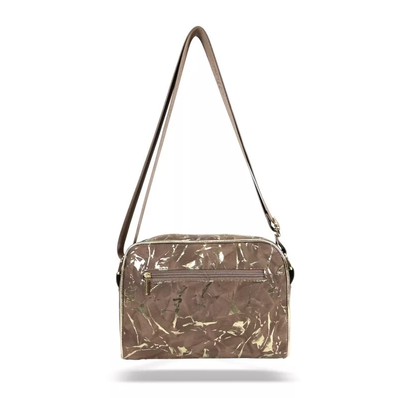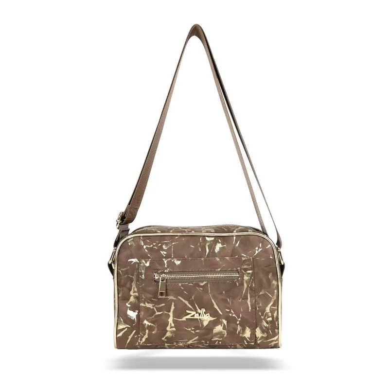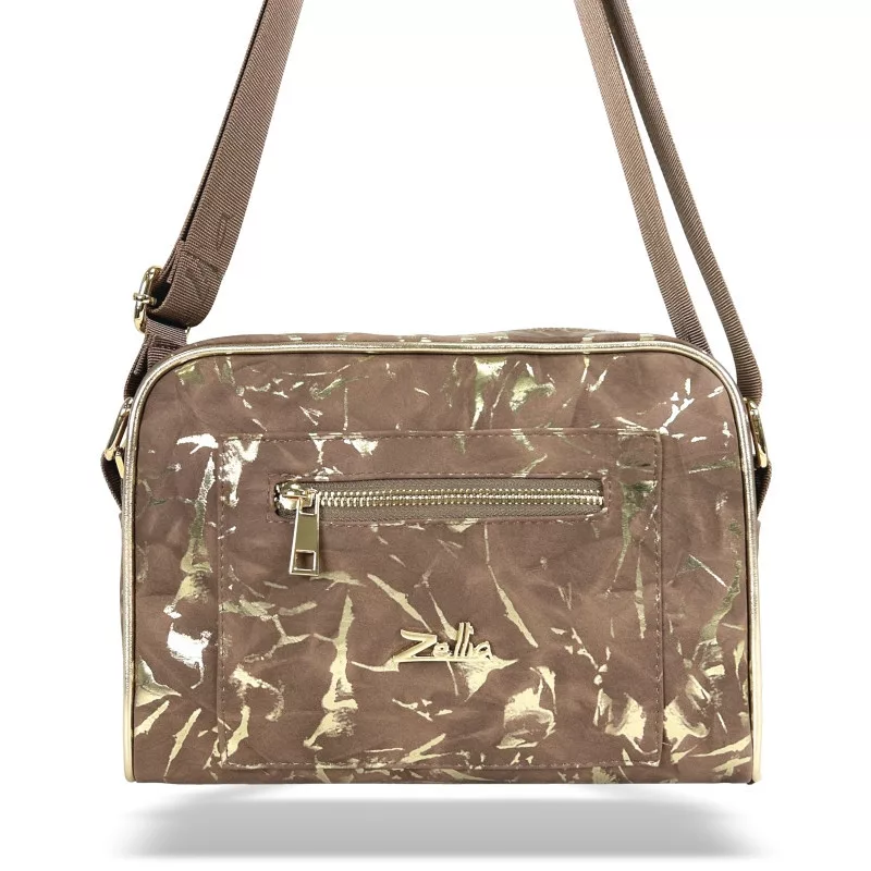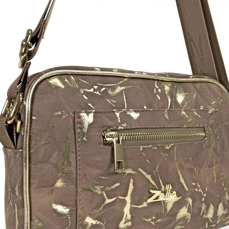 Zellia ZLB303 je špeciálna a elegantná dámska crossbody kabelka, ktorú jedinečne dotvára jemná hra hnedých a zlatých odtieňov a zamatovo hebký, matný mramorový vzor. Materiál s efektom semišu dodáva zdržanlivý elegantný vzhľad, zatiaľ čo prírodná textúra vzoru s efektom kameňa dodáva kabelke špeciálny charakter. Zlaté detaily a prvky na zips decentne zvýrazňujú moderné, ženské línie modelu.