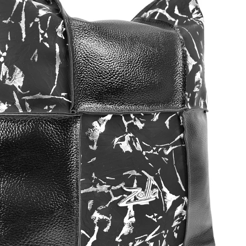 Čierna matno-strieborná mramorovaná verzia modelu Zellia 19141 ponúka moderný a jedinečný vzhľad. Horná časť tašky má matný čierny povrch z vláknitej kože, ktorý vytvára čistý, elegantný a decentný efekt. Dopĺňa to veľkolepý strieborný mramorový vzor spodného panelu, ktorý zvýrazňuje model ako charakteristický, módny a pútavý detail. Matné a mramorované textúry vytvárajú harmonický kontrast, vďaka čomu je taška skvelou voľbou pre každodenné použitie alebo špeciálne príležitosti.