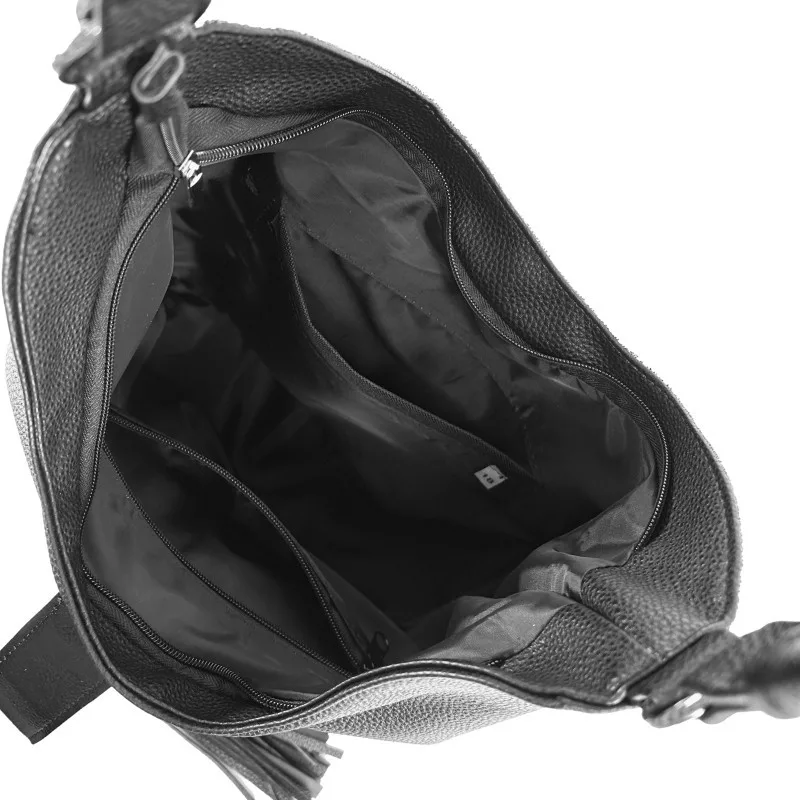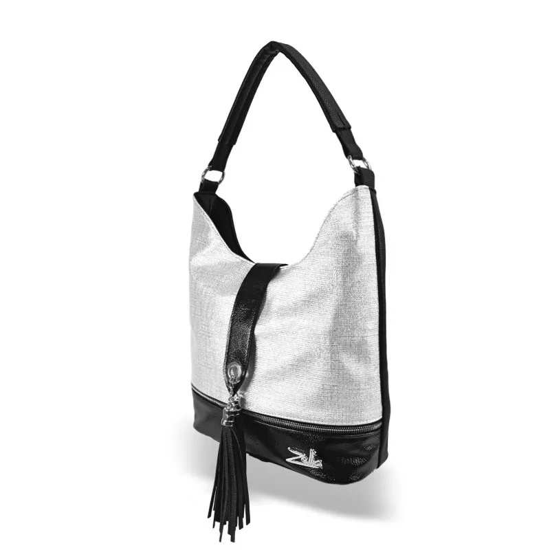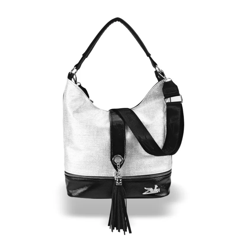 Čierno-strieborná kabelka cez rameno Zellia 24021 je moderná, elegantná a nápadne štýlová voľba. Čierna základná farba kabelky je harmonicky kombinovaná so striebornými detailmi, ktoré vytvárajú živý, no vkusný kontrast. Jej čistý tvar je charakteristickejší vďaka ozdobnému koženému strapcu, takže model sa ľahko hodí do každodenných aj ležérnych outfitov. Jej priestranná veľkosť je ideálna na každodenné použitie, či už do práce alebo do mesta.