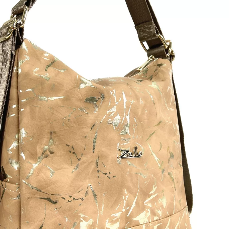 Dámska kabelka Zellia Zlb317 je sofistikovanou zmesou modernej elegancie a praktického dizajnu. Povrch s mramorovým vzorom v ťavej zlatej farbe vytvára luxusný efekt, zatiaľ čo zamatový panel s efektom semišu a jemne textúrovaná lícová koža vytvárajú harmonický kontrast. Tlmený ťaví odtieň je zvýraznený zlatým mramorovým efektom a zlatými detailmi, čo dodáva kabelke elegantný a zároveň jedinečný vzhľad.