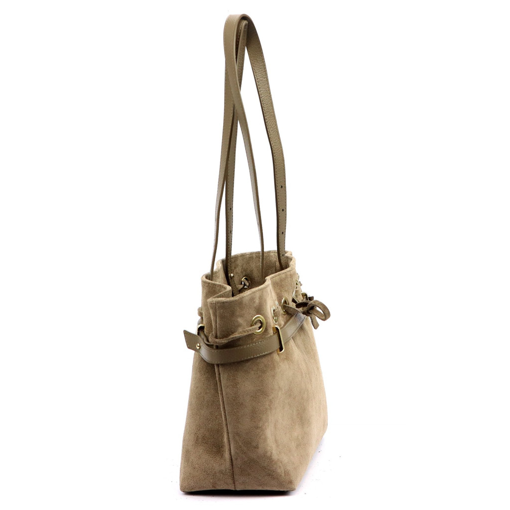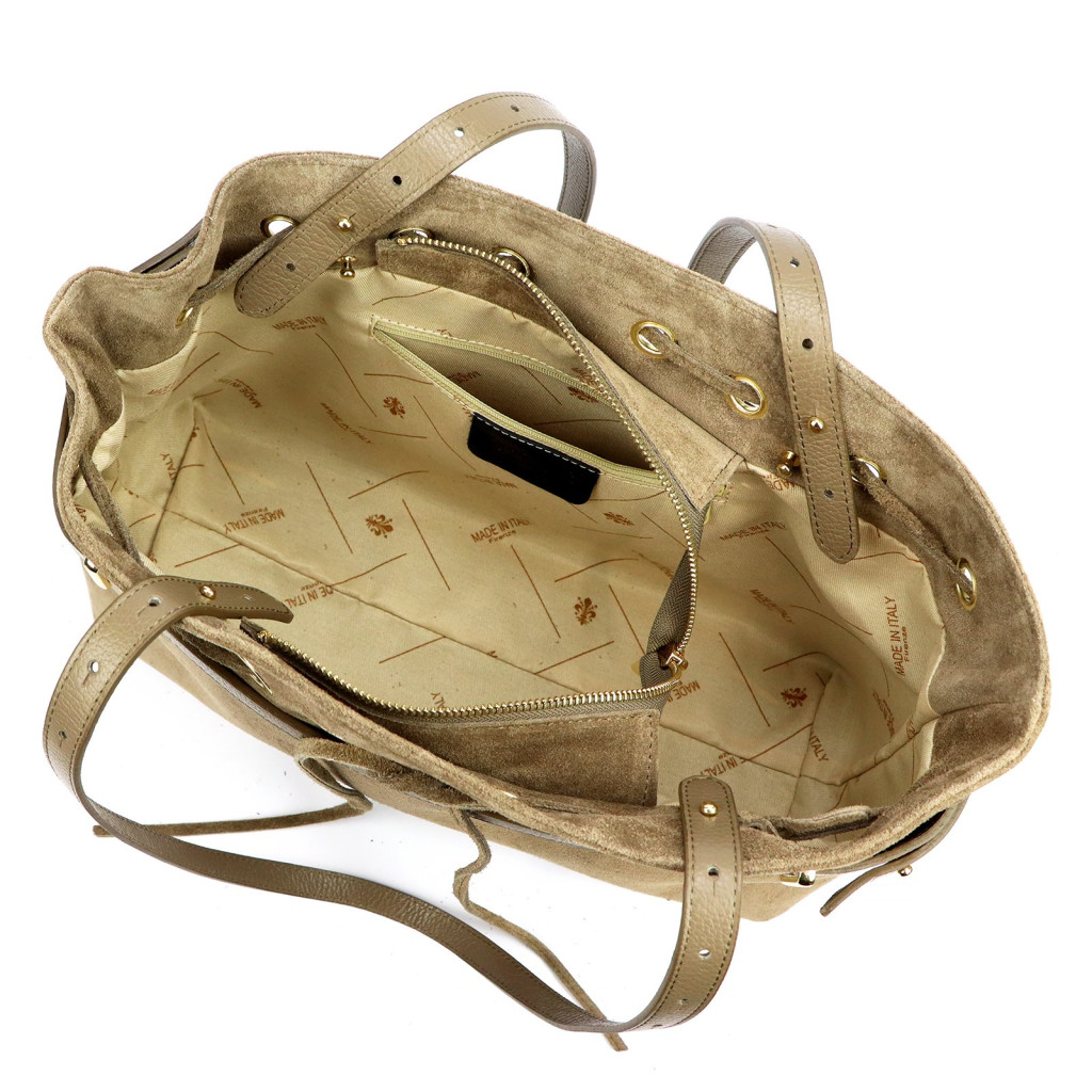 Dámska kabelka cez rameno Camilla PREMIUM 10.005je jedinečný kúsok v boho-chic štýle, ktorý elegantne kombinuje prírodnú semišovú kožu s detailmi zo zrnitej hovädzej kože. Jemný béžový odtieň vyžaruje čistú, modernú a ležérnu eleganciu, zatiaľ čo jeho prirodzený, jemný tón ju robí ženskou a harmonickou zároveň. Kombinácia hodvábneho semišového povrchu a textúrovaných kožených častí, ako aj sofistikovaných zlatých kovových doplnkov, vytvára nadčasový luxus, ktorý poskytuje špeciálny vzhľad aj v každodennom živote.