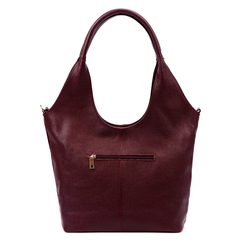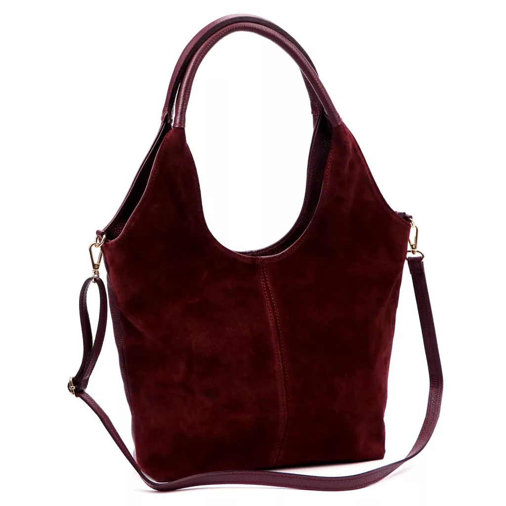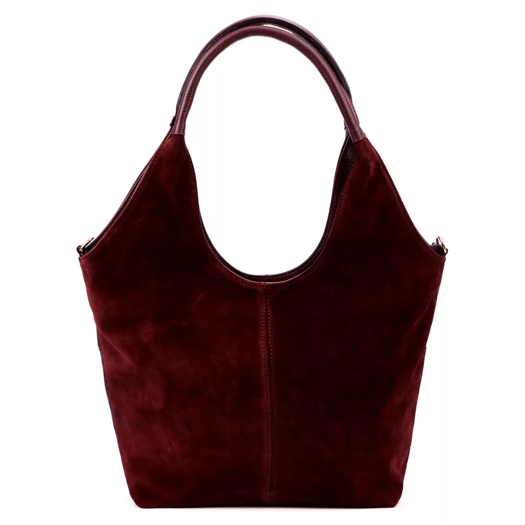 Kabelka cez rameno Luka 26-013 v bordovej farbe ponúka moderný, ženský a elegantný charakteristický vzhľad. Vyrobená z prvotriednej semišovej hovädzej kože na prednej strane a zrnitej, mierne štruktúrovanej hovädzej kože na zadnej strane, model poskytuje špeciálnu kombináciu textúry, ktorá vyžaruje mäkkosť a zároveň odolnosť. Tvar kabelky zobrazenej na obrázku má zakrivené, jemné línie a hlboký výrez v hornej časti vytvára jedinečnú, módnu siluetu. Mäkký, ergonomický ramenný popruh harmonicky kopíruje zakrivený tvar kabelky a poskytuje pohodlné nosenie.
