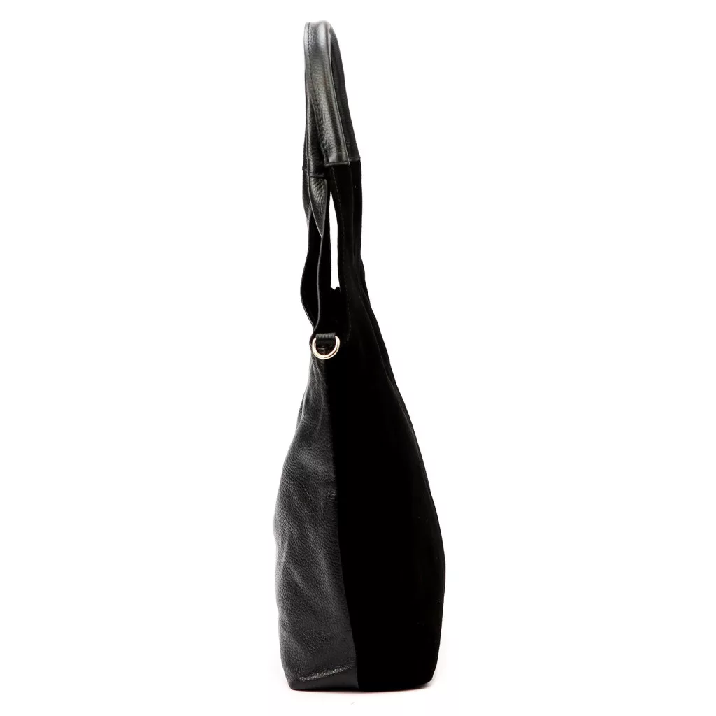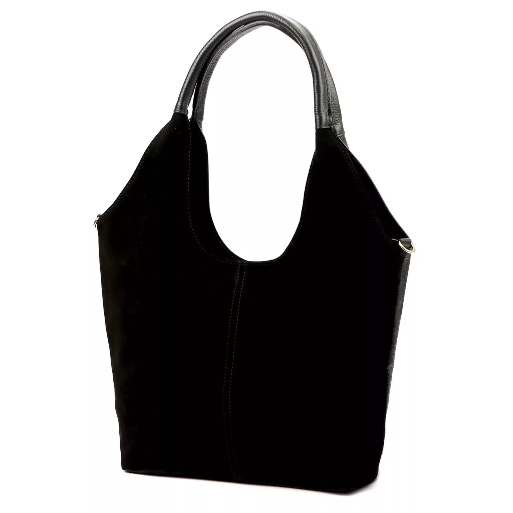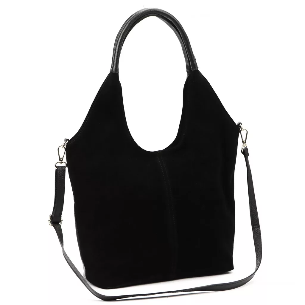 Čierna ramenná kabelka Luka 26-013 je čistým, nadčasovým kúskom modernej ženskej elegancie. Model, vyrobený z prednej strany z prvotriednej semišovej hovädzej kože a zadnej strany z jemne štruktúrovanej hovädzej kože, ponúka špeciálnu kombináciu textúr: zamatový pocit semišu jemne vyvažuje pevný úchop kože. Tvar kabelky má zakrivené, jemné línie s charakteristickým hlbokým výrezom v hornej časti, ktorý vytvára jedinečnú, modernú siluetu, ktorá je na obrázku jasne viditeľná. Mäkký, ergonomický ramenný popruh kopíruje tvar kabelky a zaisťuje pohodlné nosenie.