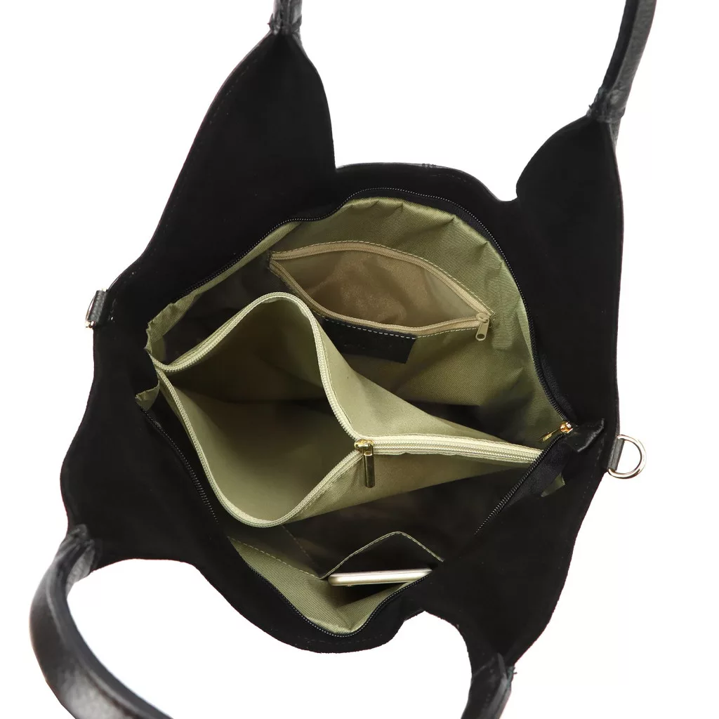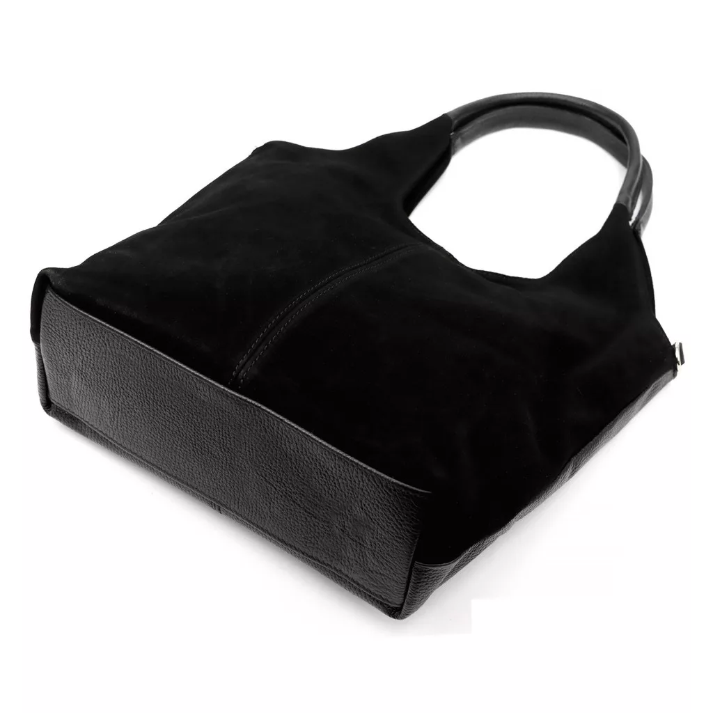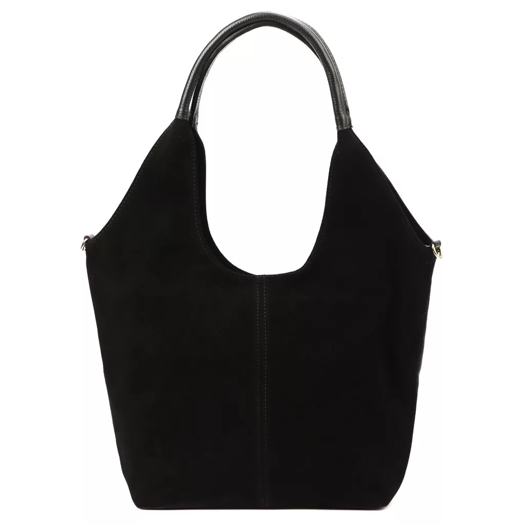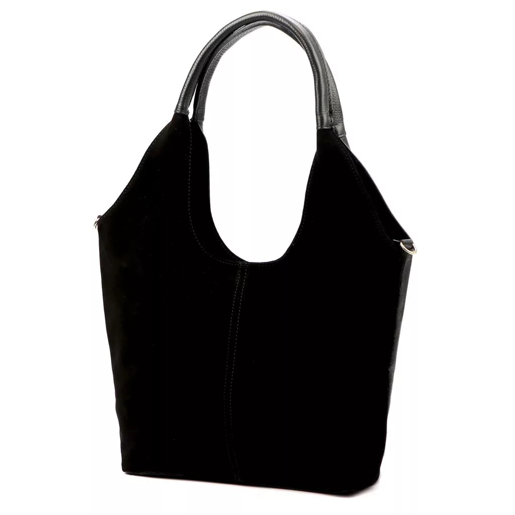 Čierna ramenná kabelka Luka 26-013 je čistým, nadčasovým kúskom modernej ženskej elegancie. Model, vyrobený z prednej strany z prvotriednej semišovej hovädzej kože a zadnej strany z jemne štruktúrovanej hovädzej kože, ponúka špeciálnu kombináciu textúr: zamatový pocit semišu jemne vyvažuje pevný úchop kože. Tvar kabelky má zakrivené, jemné línie s charakteristickým hlbokým výrezom v hornej časti, ktorý vytvára jedinečnú, modernú siluetu, ktorá je na obrázku jasne viditeľná. Mäkký, ergonomický ramenný popruh kopíruje tvar kabelky a zaisťuje pohodlné nosenie.