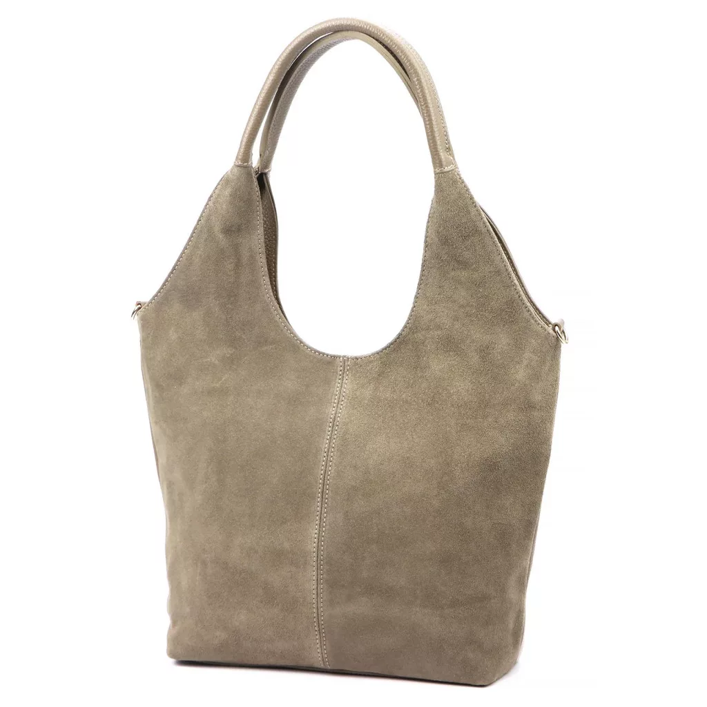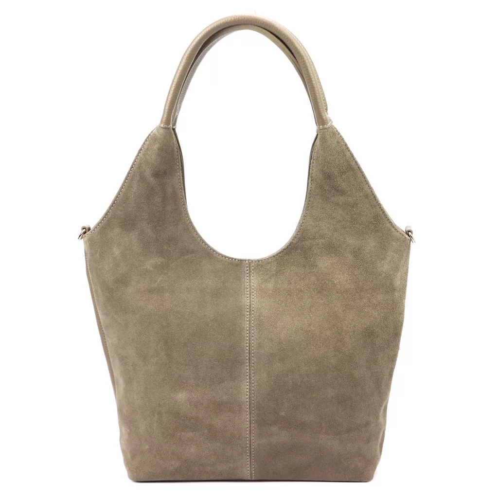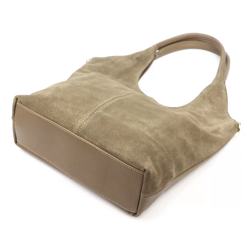 Taupe kabelka cez rameno Luka 26-013 predstavuje dokonalú harmóniu modernej elegancie a čistej ženskosti. Vyrobená z prednej časti z prvotriednej semišovej hovädzej kože a zadnej časti z jemne štruktúrovanej hovädzej kože, model ponúka sofistikovanú kombináciu textúr - zamatová mäkkosť mäkkého semišu a pevnosť štruktúrovanej kože sa harmonicky dopĺňajú. Tvar kabelky má zakrivené, prirodzené línie a hlboký výrez v hornej časti dodáva kabelke špeciálnu, modernú siluetu, ktorá je zároveň ženská a elegantná. Mäkký, zakrivený ramenný popruh zobrazený na obrázku zaisťuje ergonomické a pohodlné nosenie.