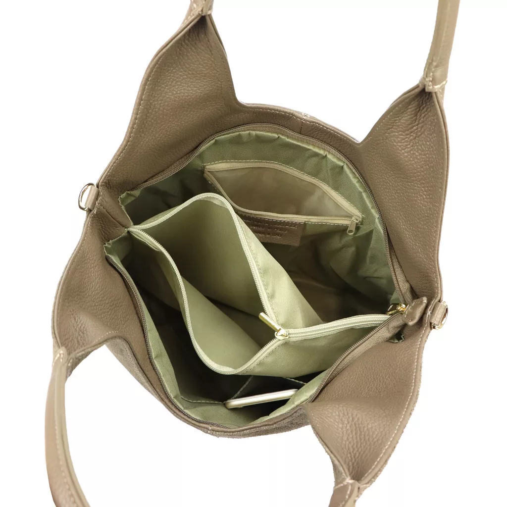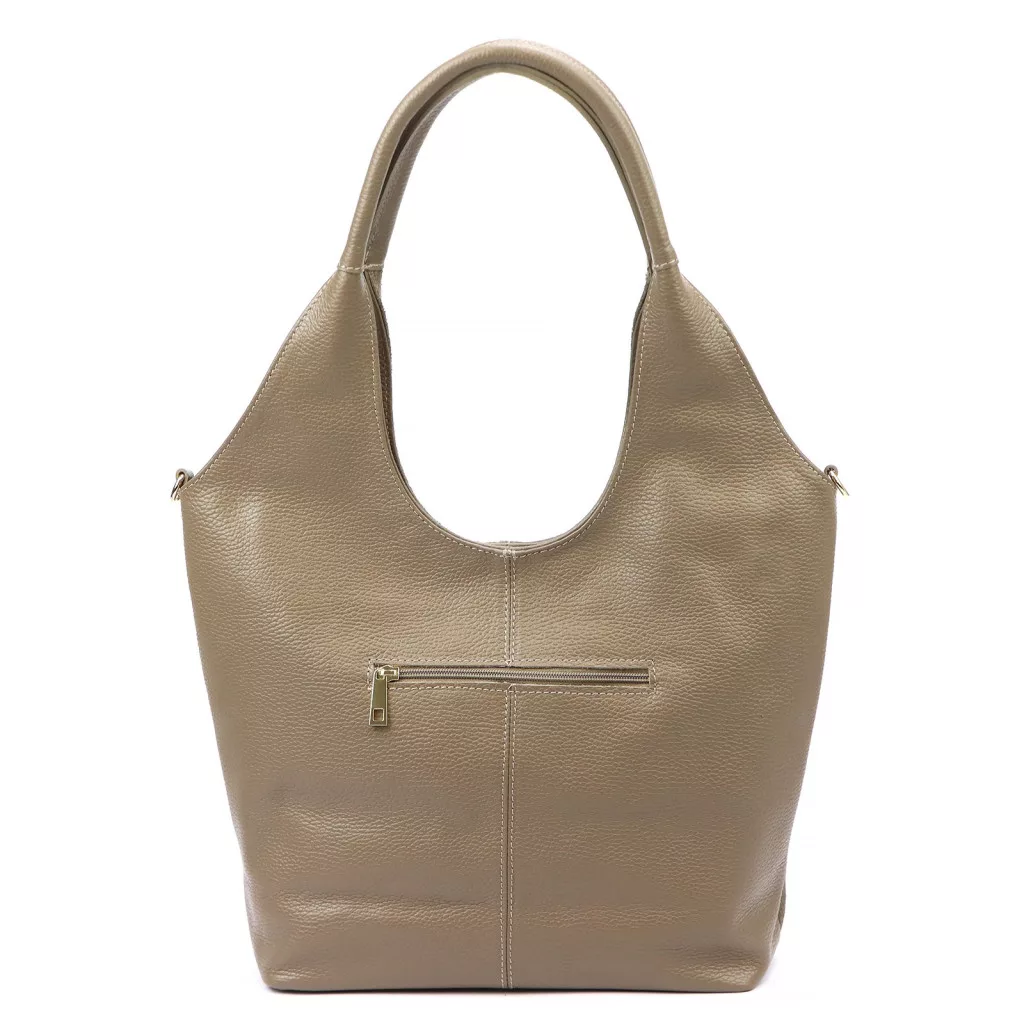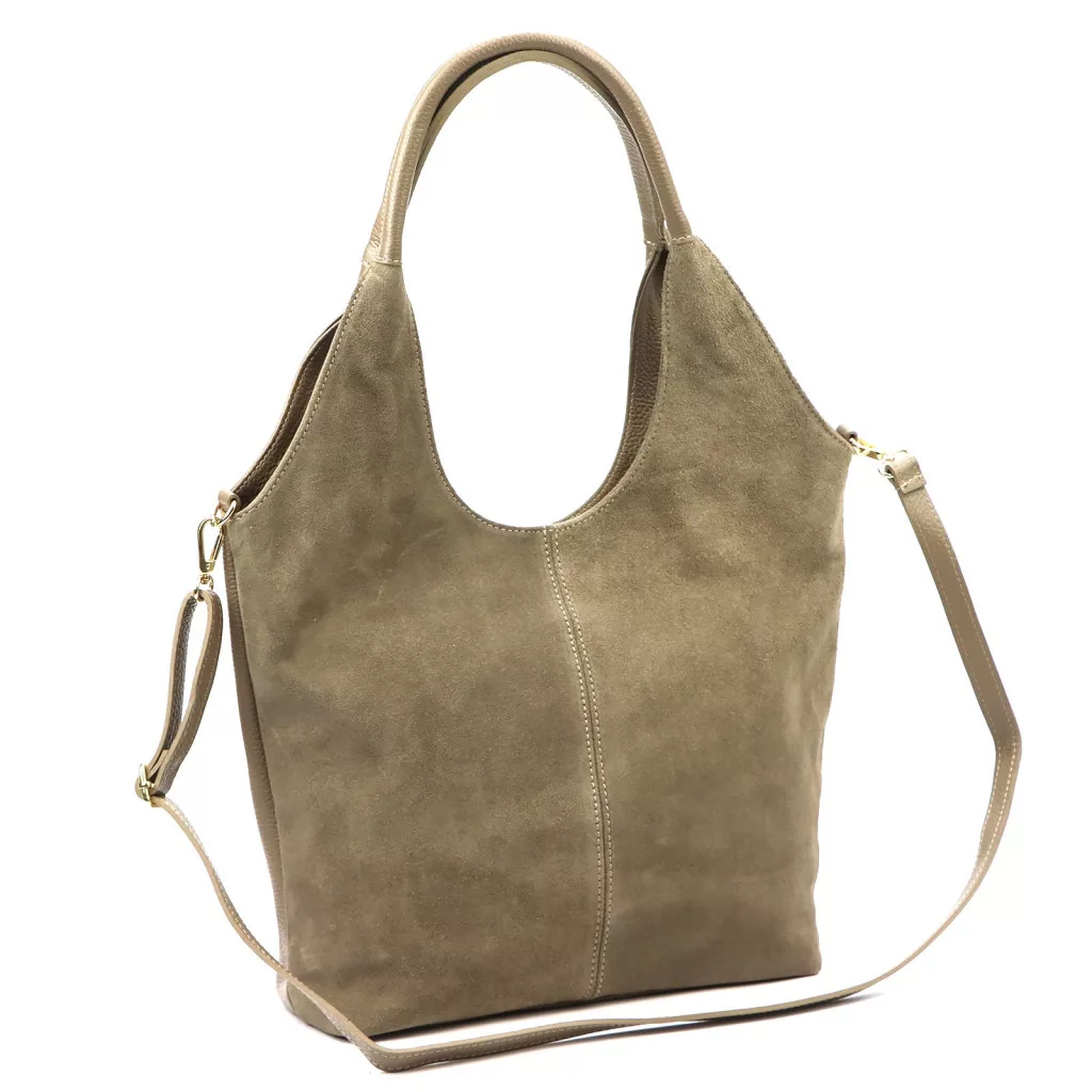 Taupe kabelka cez rameno Luka 26-013 predstavuje dokonalú harmóniu modernej elegancie a čistej ženskosti. Vyrobená z prednej časti z prvotriednej semišovej hovädzej kože a zadnej časti z jemne štruktúrovanej hovädzej kože, model ponúka sofistikovanú kombináciu textúr - zamatová mäkkosť mäkkého semišu a pevnosť štruktúrovanej kože sa harmonicky dopĺňajú. Tvar kabelky má zakrivené, prirodzené línie a hlboký výrez v hornej časti dodáva kabelke špeciálnu, modernú siluetu, ktorá je zároveň ženská a elegantná. Mäkký, zakrivený ramenný popruh zobrazený na obrázku zaisťuje ergonomické a pohodlné nosenie.