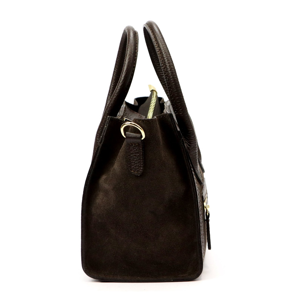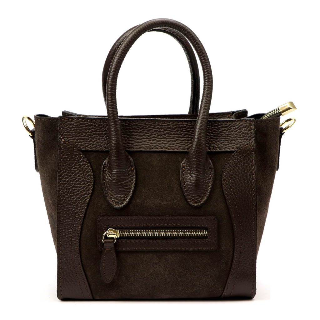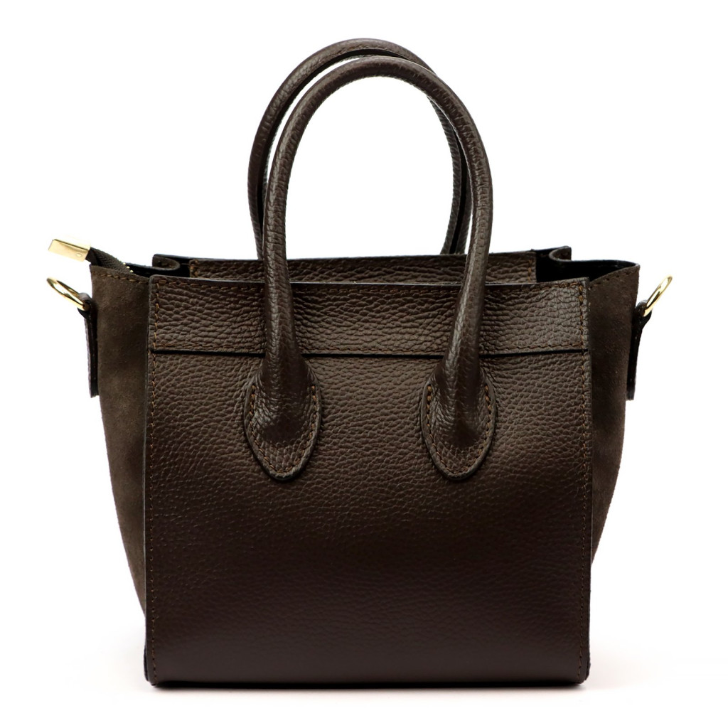 Tmavohnedá kabelka Luka 26-055 ponúka decentne elegantný, no zároveň moderný vzhľad, ktorý je skutočne výnimočný harmonickou kombináciou zrnitej, mierne štruktúrovanej hovädzej kože a semišovej hovädzej kože. Dizajn kabelky je kompaktný, ženský a charakteristický a dvojitá rukoväť poskytuje stabilný a pohodlný úchop. Hlboký, sýty tmavohnedý odtieň je nadčasový a ľahko kombinovateľný, ideálna voľba pre milovníčky každodennej elegancie.