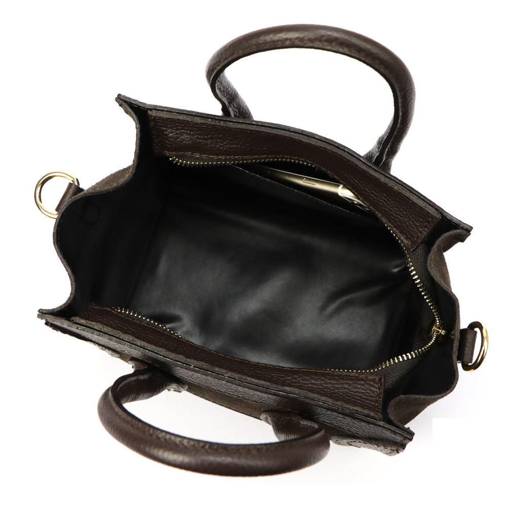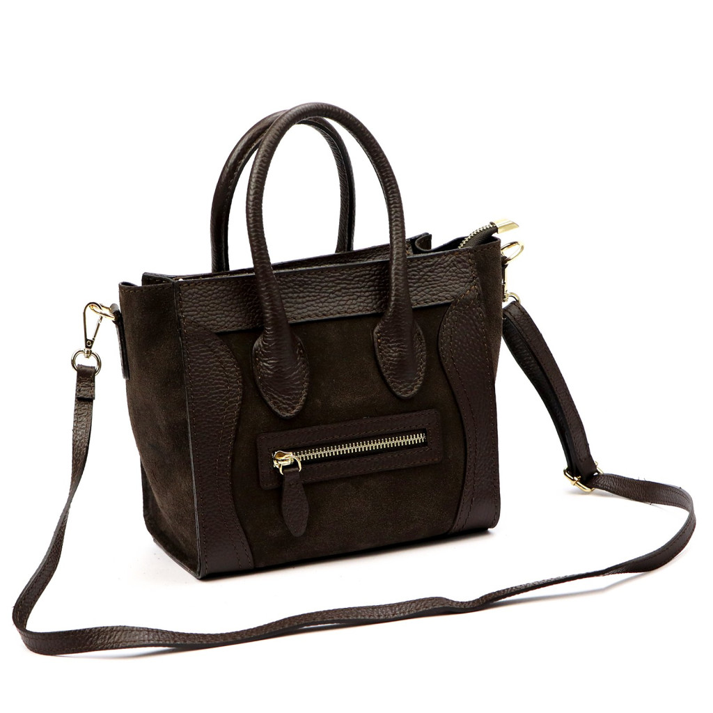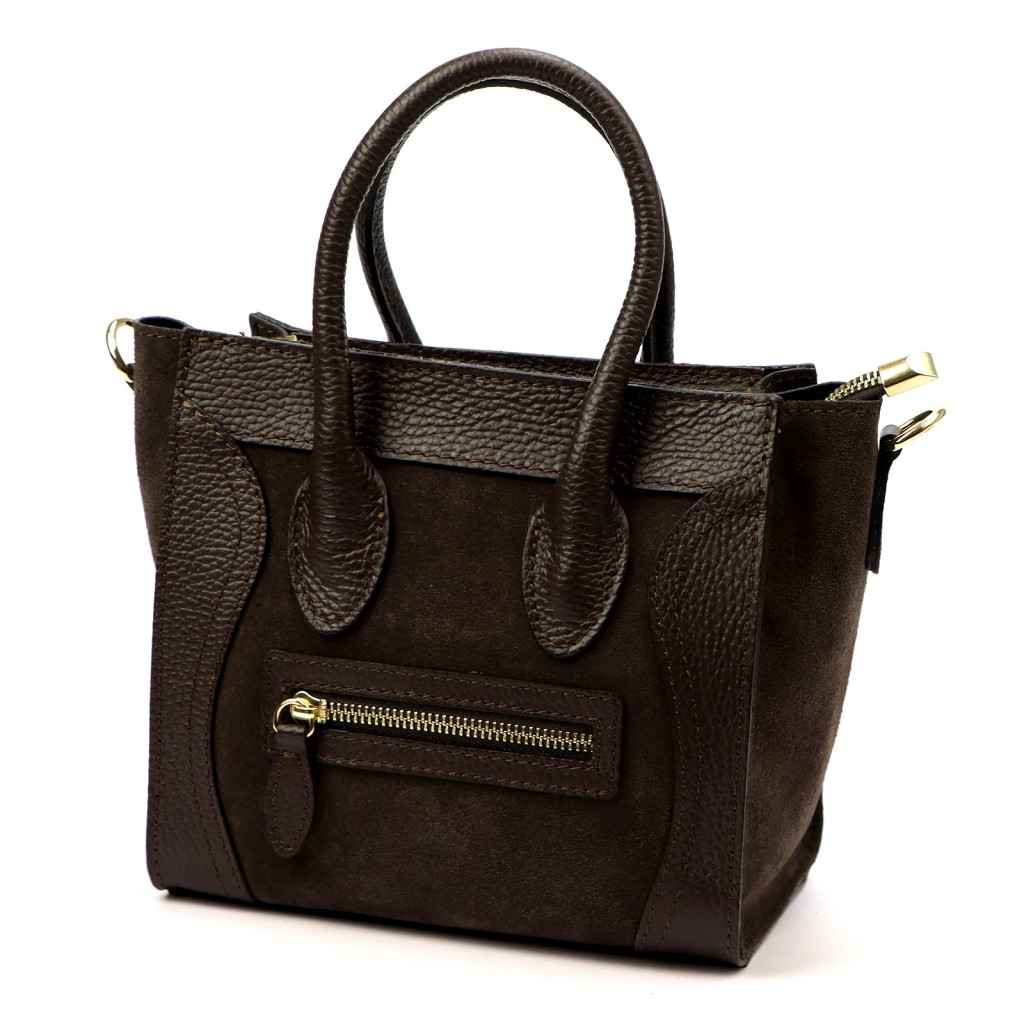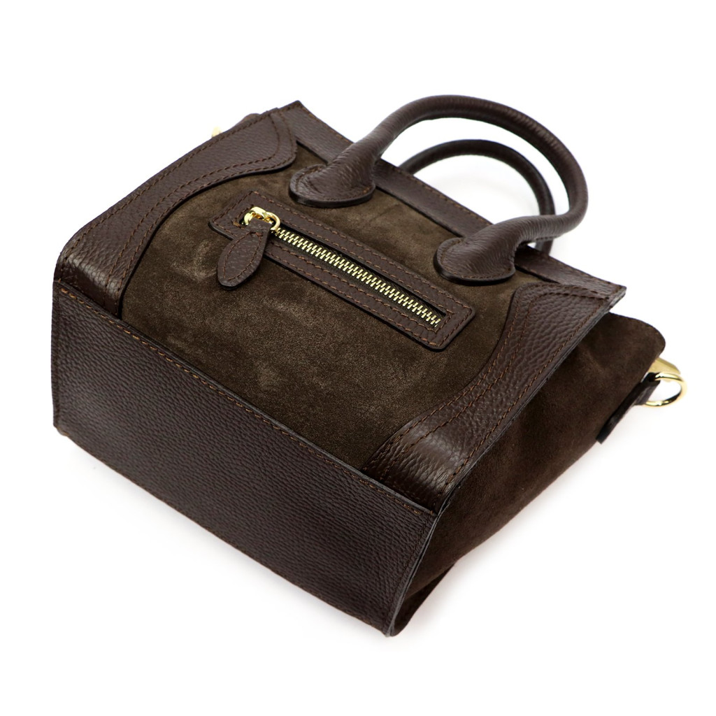 Tmavohnedá kabelka Luka 26-055 ponúka decentne elegantný, no zároveň moderný vzhľad, ktorý je skutočne výnimočný harmonickou kombináciou zrnitej, mierne štruktúrovanej hovädzej kože a semišovej hovädzej kože. Dizajn kabelky je kompaktný, ženský a charakteristický a dvojitá rukoväť poskytuje stabilný a pohodlný úchop. Hlboký, sýty tmavohnedý odtieň je nadčasový a ľahko kombinovateľný, ideálna voľba pre milovníčky každodennej elegancie.
