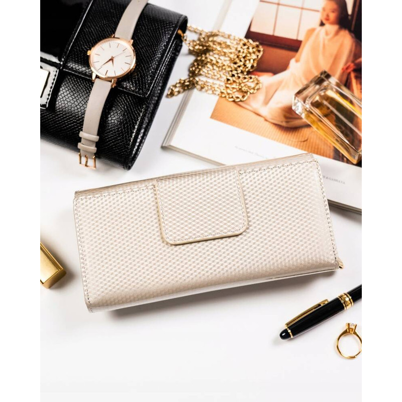Elegantná dámska peňaženka so zapínaním na patentný knoflík, ktorá predstavuje prémiovú kvalitu značky Peterson. Vyrobená zo starostlivo vybranej prírodnej kože, s lakovaným povrchom a jemným geometrickým vzorom. Vďaka modernému a zároveň nadčasovému dizajnu je vhodný na každú príležitosť.