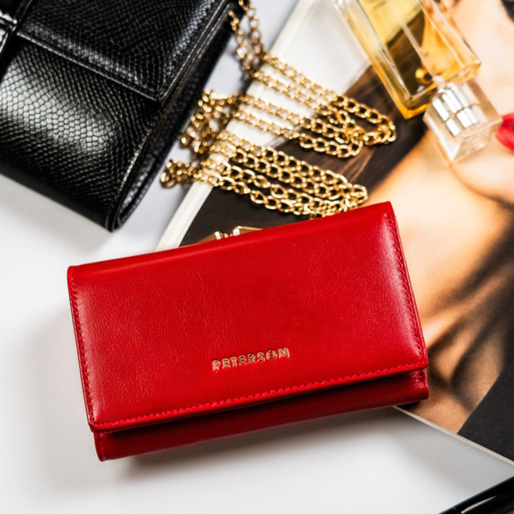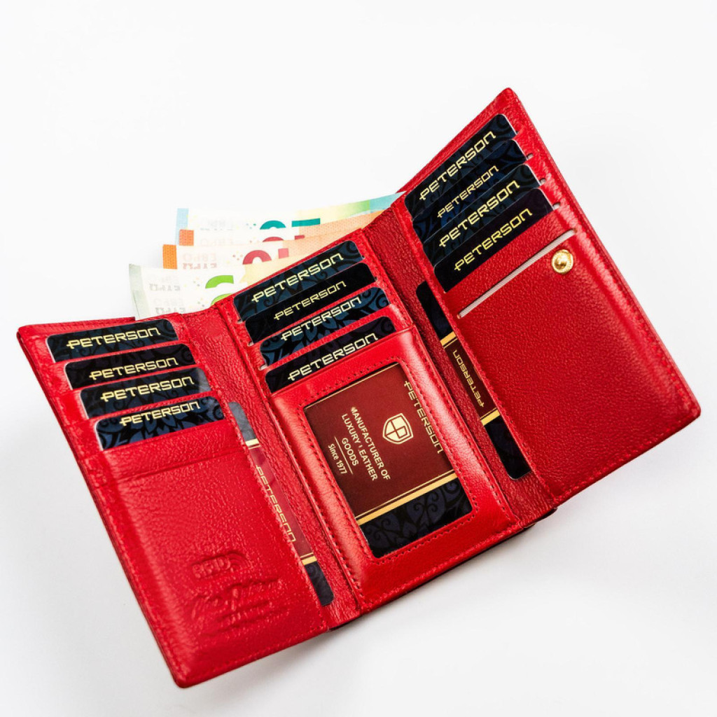 Dámska peňaženka z hovädzej kože Peterson PTN 55020-SGNv červenej farbe je elegantný, moderný a kvalitný doplnok, ktorý je v každom detaile prispôsobený potrebám žien. Prémiová hovädzia koža je na dotyk mäkká a odolná a červená farba je skutočne ženská a výrazná. Zlaté doplnkyešte viac umocňujú pocit luxusu, vďaka čomu je peňaženka nielen praktická, ale aj veľkolepý módny doplnok.