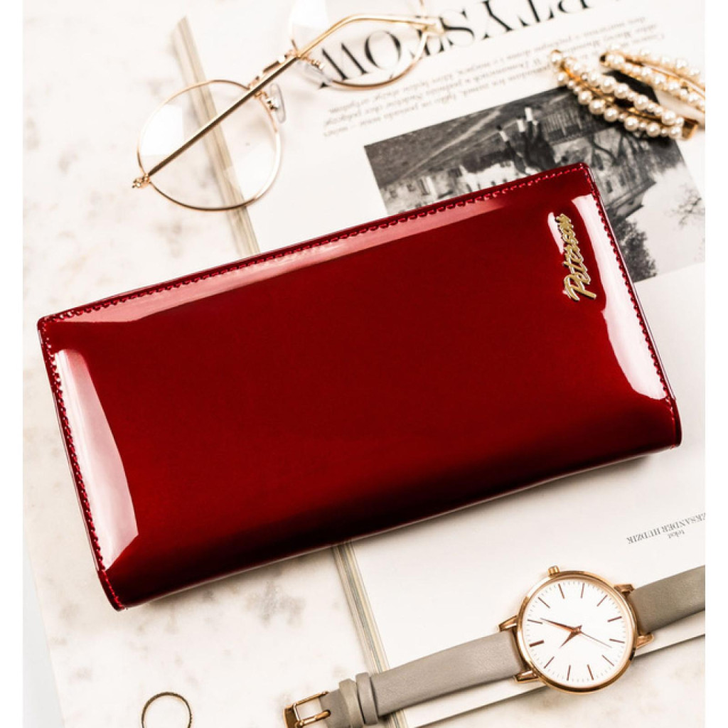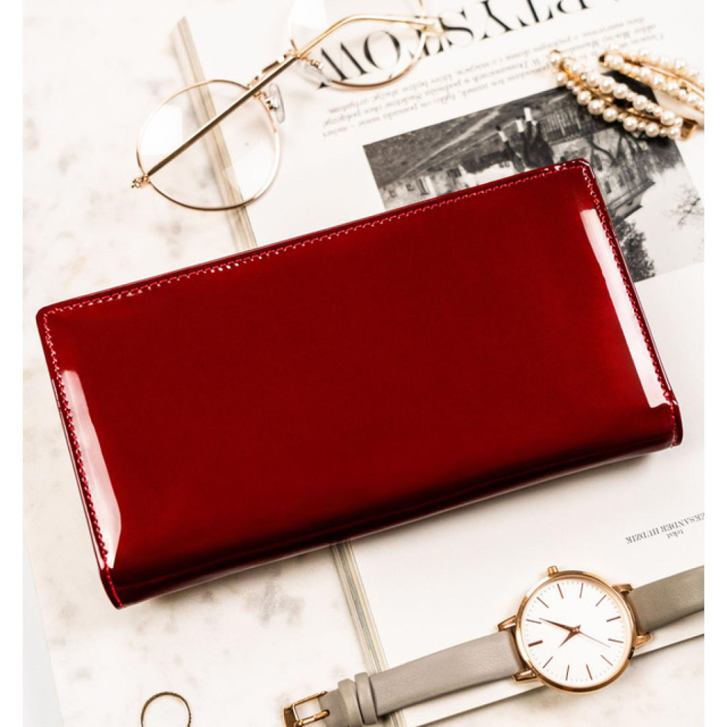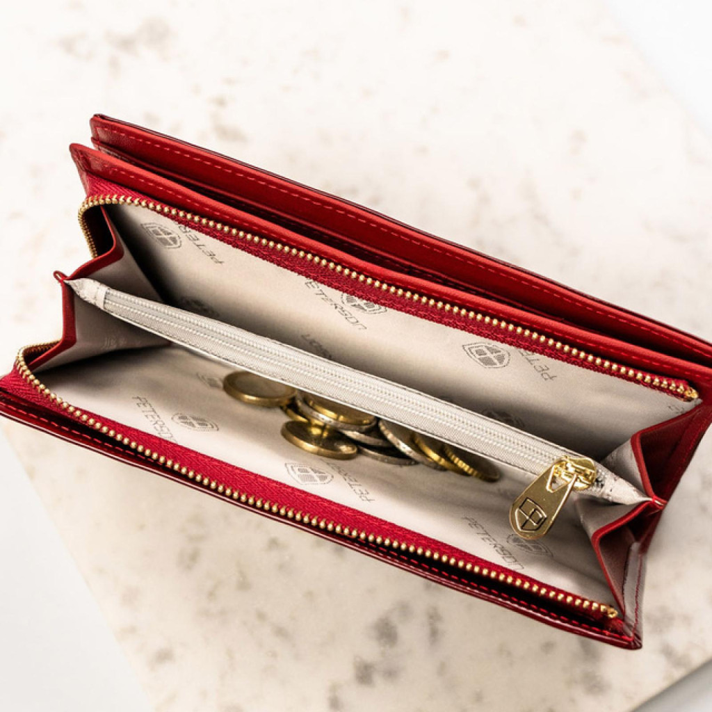 Dámska peňaženka Peterson PTN BC-421431 z hovädzej kože, červená, v sebe spája klasickú ženskosť a modernú funkčnosť. Jej lesklá červená lakovaná koža na prvý pohľad vyžaruje eleganciu a zlaté doplnky jej vzhľad ešte viac umocňujú exkluzivitu. Vďaka vzpriamenému tvaru je kompaktná, no zároveň ľahko viditeľná a praktická, vďaka čomu je ideálnou voľbou na každodenné použitie.