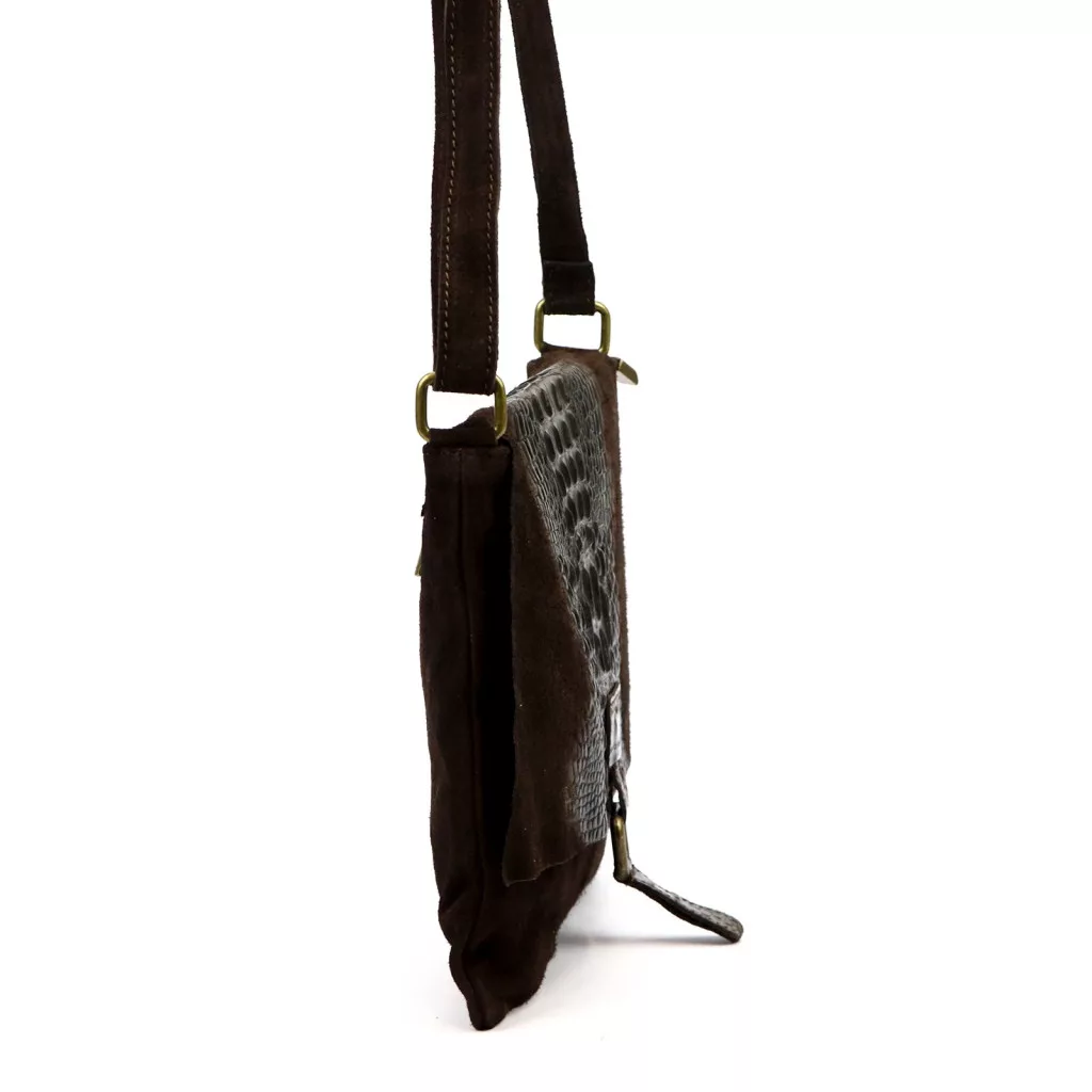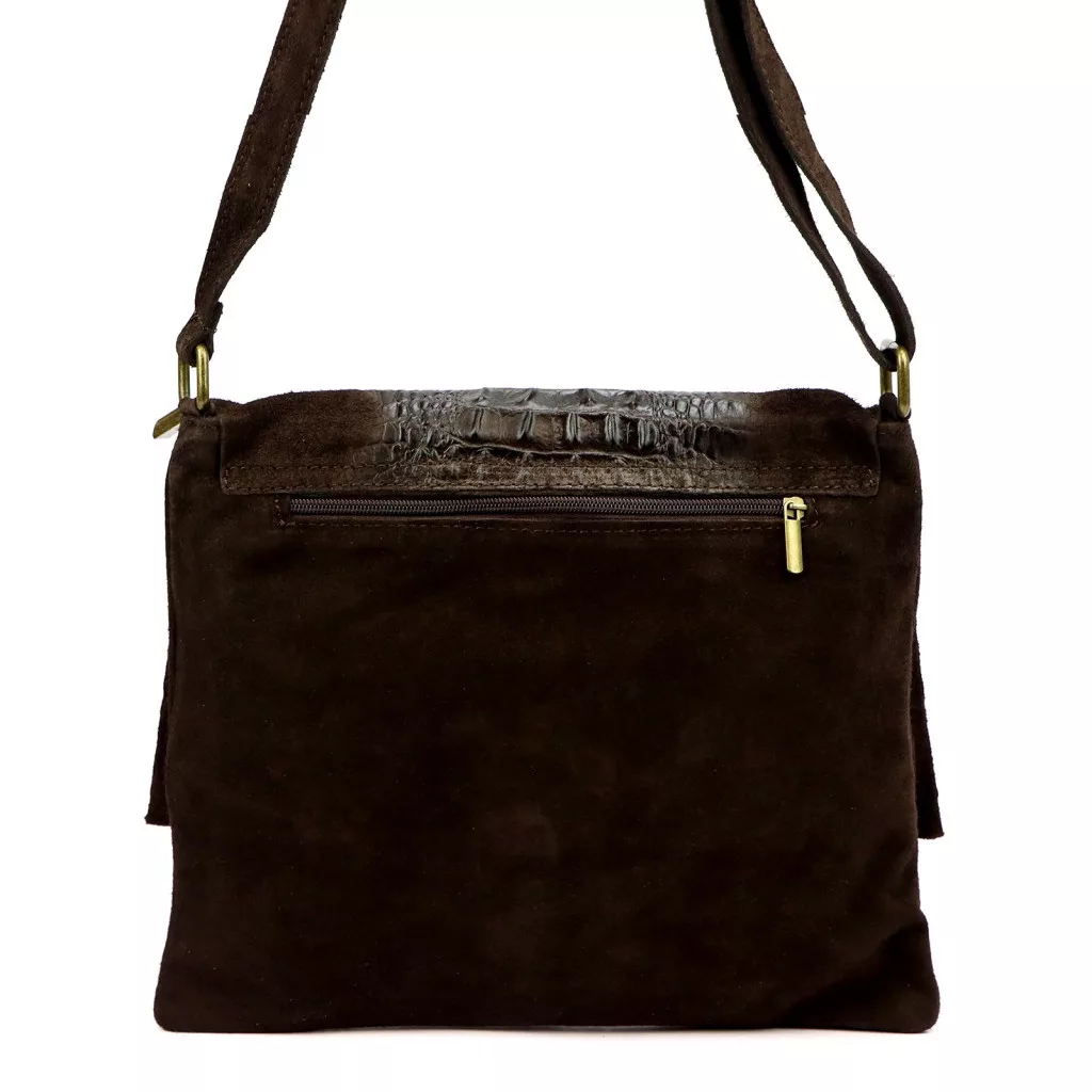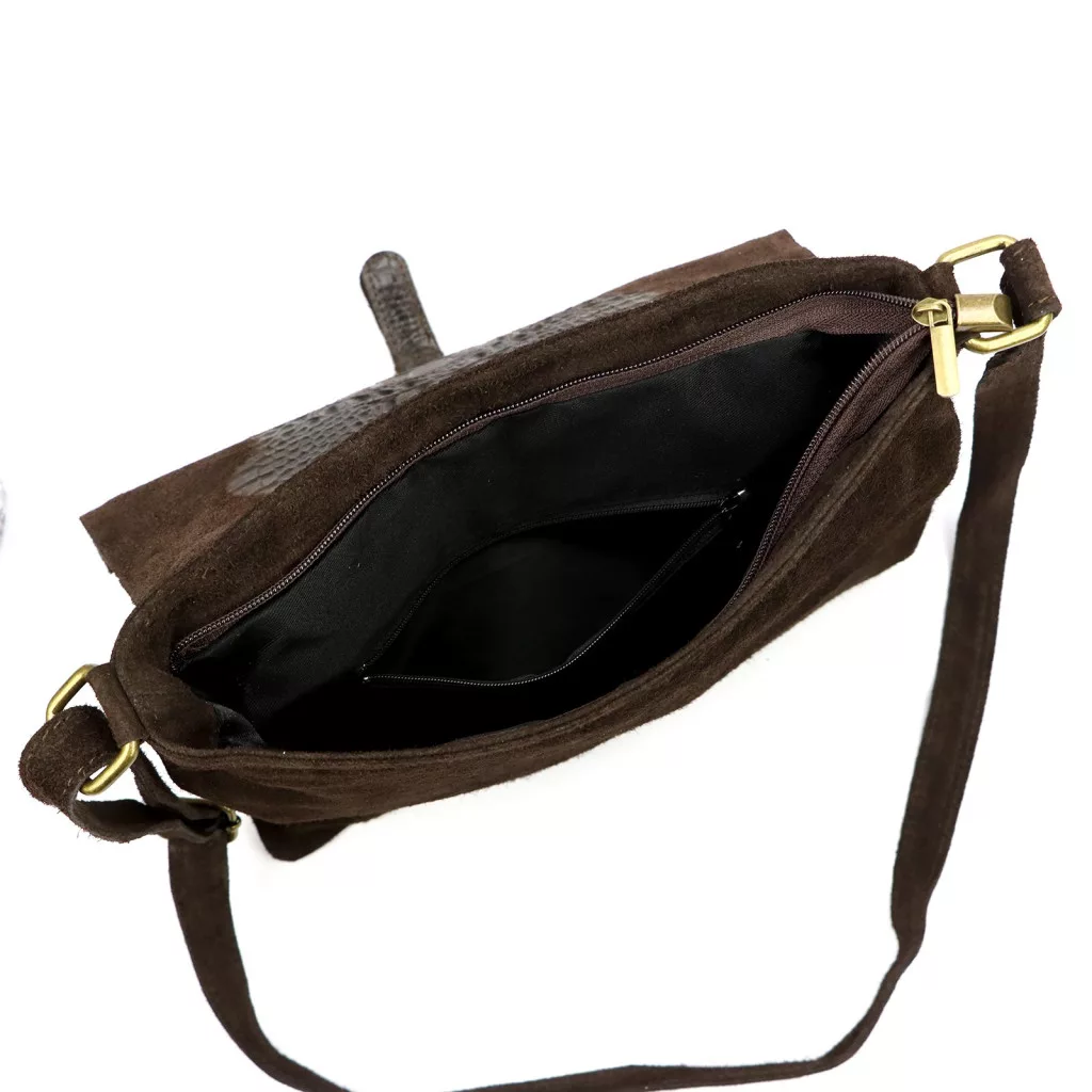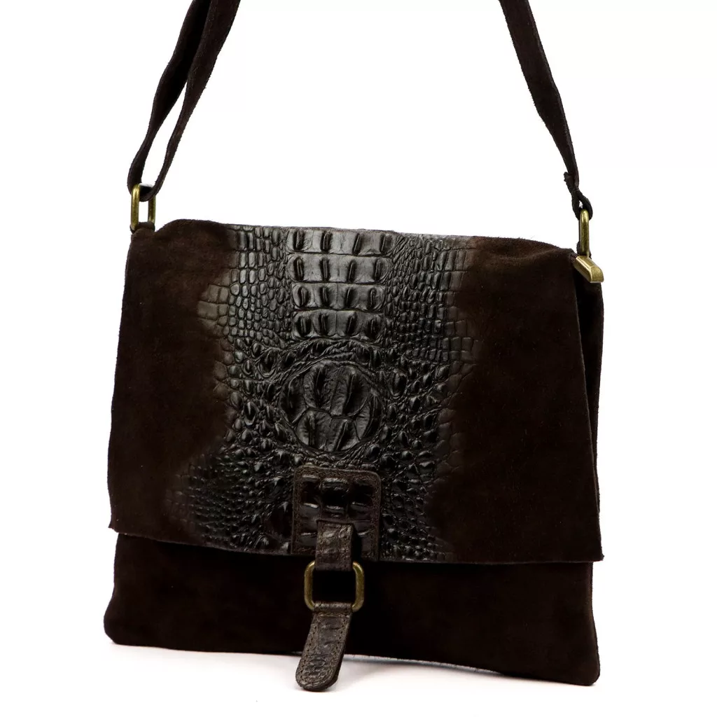 Dámska kabelka Luka 26-076 CROCO v tmavohnedej farbe ponúka špeciálny, sofistikovaný a rozhodne elegantný vzhľad. Hlboký, zamatový povrch prémiovej semišovej hovädzej kože a prechod textúrovaných vložiek s krokodílím vzorom vytvárajú skutočne charakteristický celkový efekt. Tmavohnedý odtieň pôsobí nadčasovo, luxusne a je perfektnou voľbou pre tých, ktorí chcú decentný, no zároveň výrazný vzhľad. Jeho plochejší, štruktúrovaný tvar zaisťuje elegantné držanie a preklápací patentný uzáver ponúka klasické a bezpečné zapínanie.