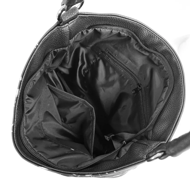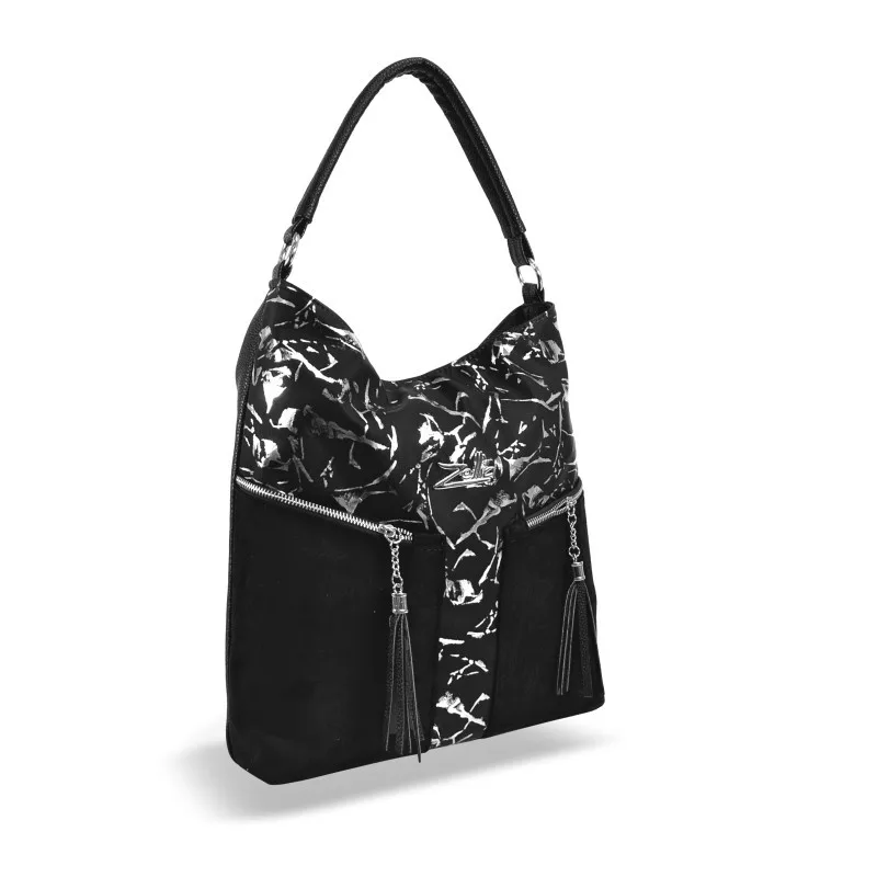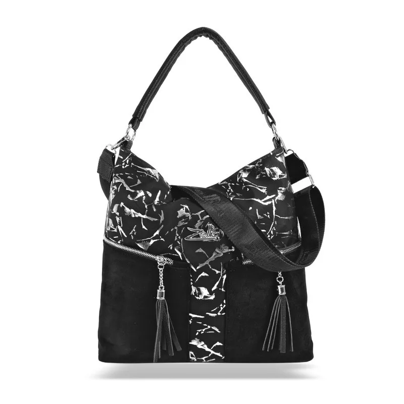 Dámska kabelka cez rameno Zellia 21052 je dokonalou kombináciou modernej elegancie a špeciálneho použitia materiálov. Kombinácia čierneho semišu a striebornej mramorovej vzorovanej vláknitej kože dodáva kabelke jedinečný, sofistikovaný vzhľad. Striedanie matných a lesklých povrchov vytvára špeciálnu textúru, ktorá vytvára prémiový efekt, pričom kabelka zostáva ženská a osobitá.