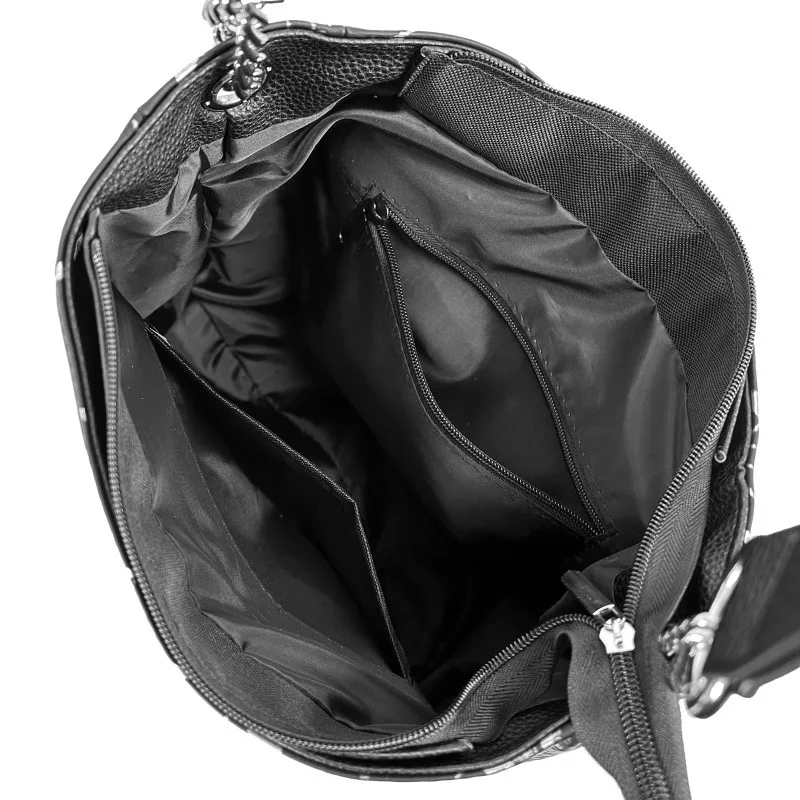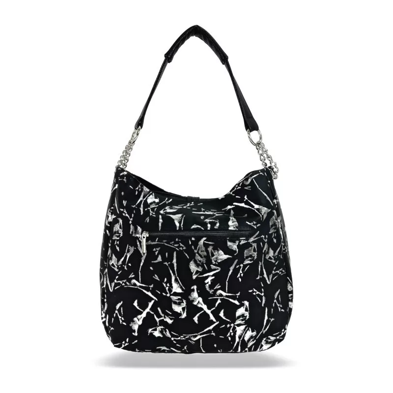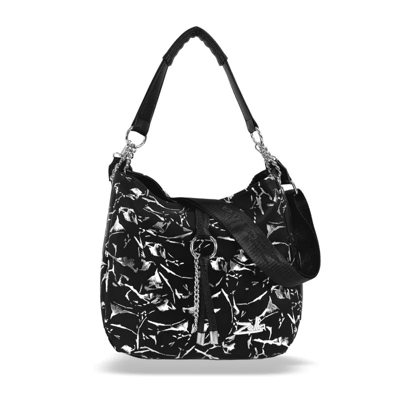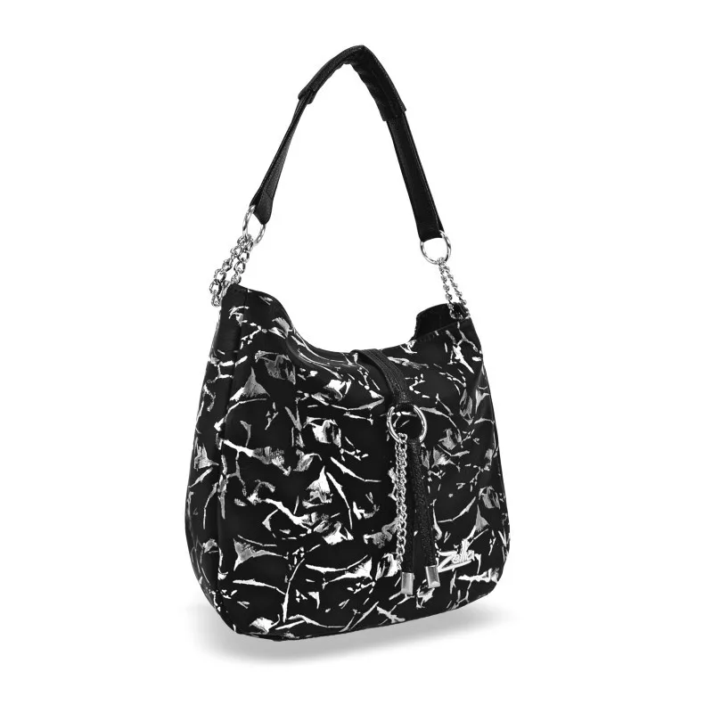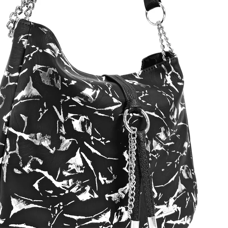 Dámska kabelka cez rameno Zellia 22117 je moderný, elegantný a všestranný doplnok, ktorý je jedinečný vďaka harmonickému kontrastu čiernych a strieborných odtieňov a špeciálnemu charakteru povrchu s mramorovým vzorom. Jemne lesklý vzor na povrchu kabelky vytvára prémiový efekt, zatiaľ čo čierna základná farba vyžaruje decentnú eleganciu – vďaka čomu je perfektnou voľbou na každodenné nosenie alebo ležérny vzhľad.