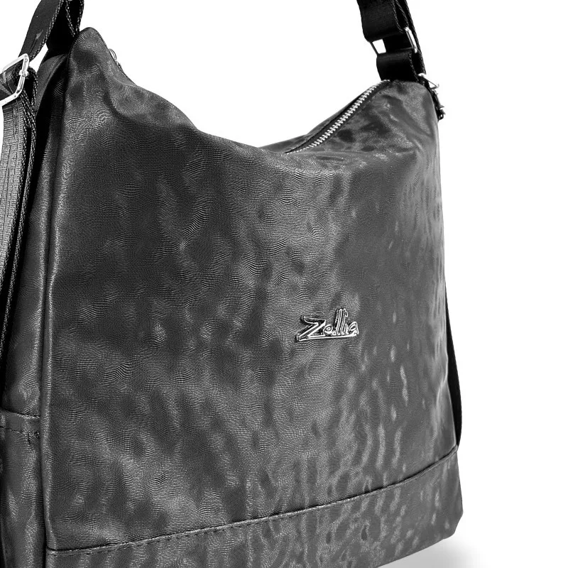 Dámska kabelka Zellia Zlb317 je v tejto verzii v elegantnom čiernom odtieni, ktorý je ozvláštnený jemne zvlneným, hodvábne lesklým povrchom. Textúra vytvára jemnú hru svetla a tieňa, takže vzhľad kabelky je moderný a exkluzívny, no zároveň zdržanlivo elegantný.