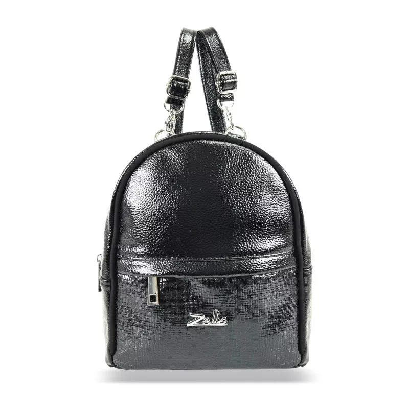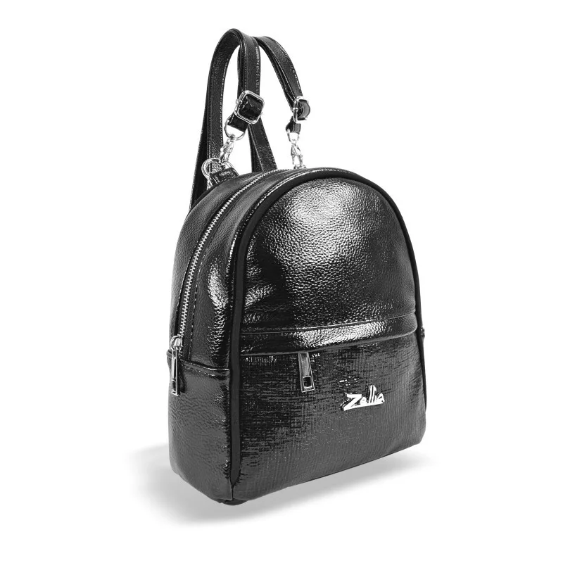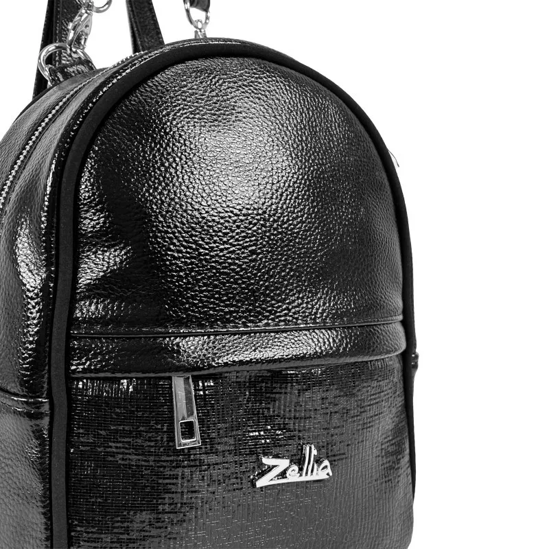 Čierny dámsky batoh Zellia Zlb301 s moderným a elegantným vzhľadom je ideálnou voľbou pre milovníčky mestského štýlu. Napriek kompaktným rozmerom má praktický a prehľadný dizajn. Tašku ozvláštňuje kombinácia dvoch druhov lícovej kože: vrchná časť má jemne zrnitú, mierne lesklú štruktúru, zatiaľ čo spodná časť je vyrobená z lesklej, mierne reliéfnej, laku podobnej textúry, ktorá vytvára elegantný kontrast.