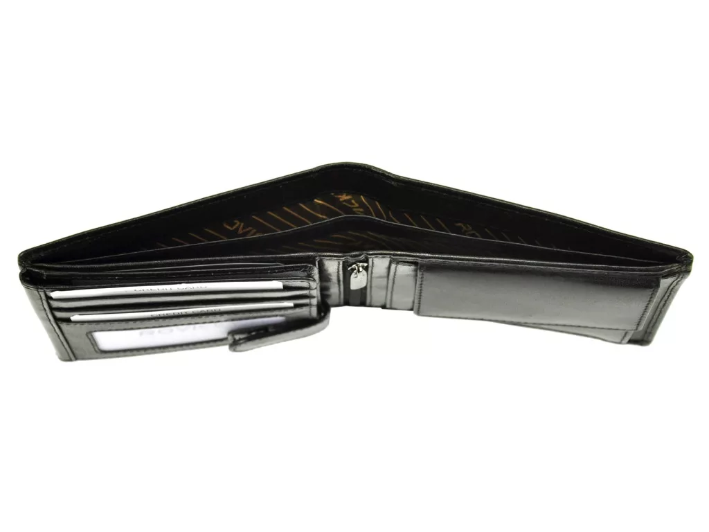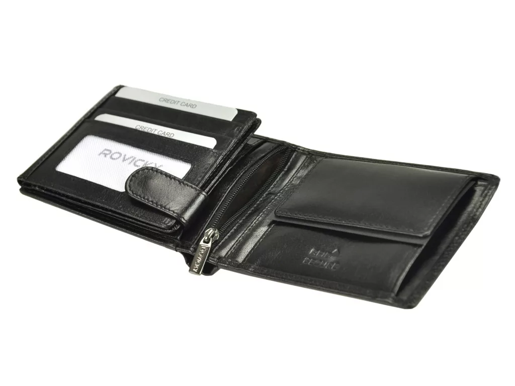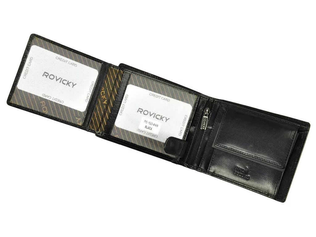 Pánska kožená peňaženka Rovicky PC-103-BAR RFID čiernaje spoľahlivým spoločníkom na každodenné nosenie vďaka prémiovému materiálu, moderným bezpečnostným prvkom a klasickému vzhľadu.