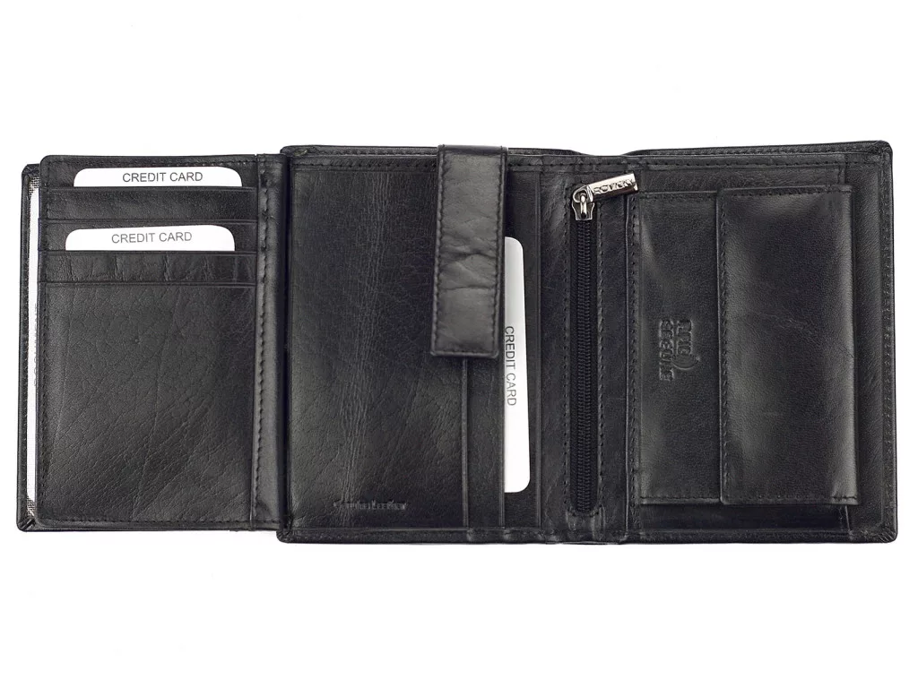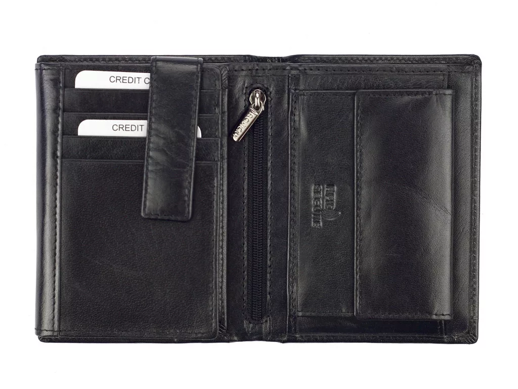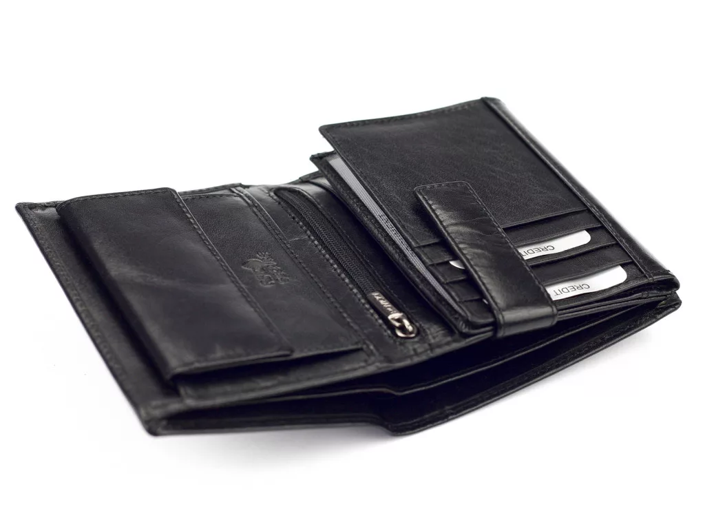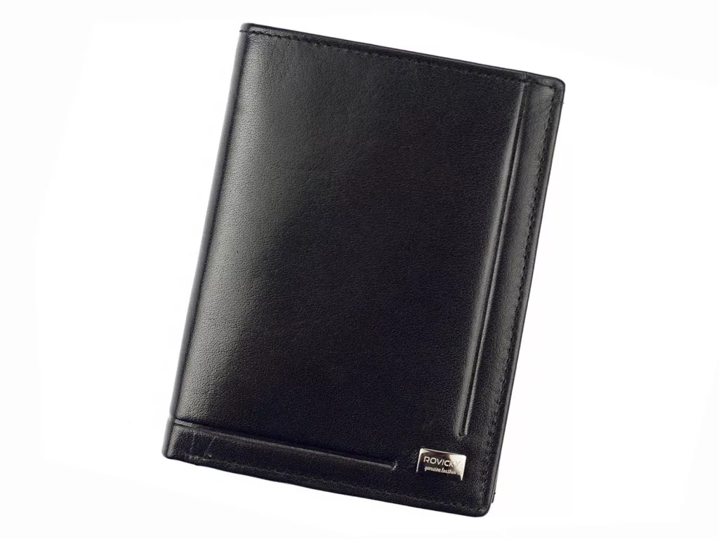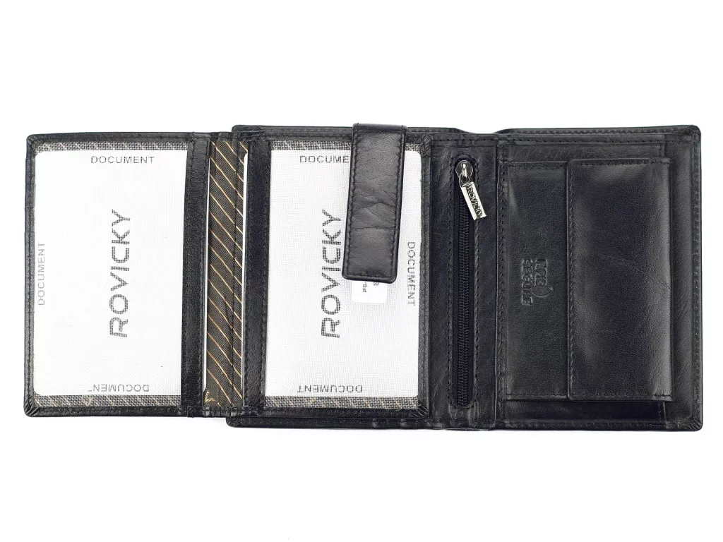 Pánska peňaženka Rovicky PC-104-BAR RFIDz čiernej hovädzej kože je elegantná, praktická a nadčasová voľba na každodenné použitie. Jej stojaci dizajn je moderný a pohodlný a prémiový hovädzí materiál dodáva odolný a sofistikovaný vzhľad. Vnútorné usporiadanie peňaženky je premyslené a dobre organizované, takže všetky dôležité dokumenty a platobné prostriedky sú ľahko poruke.