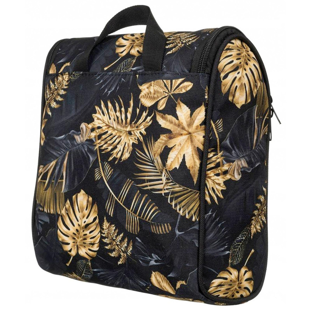 Viacfarebná kozmetická taštička s rastlinným vzorom má štvorcový tvar s mierne zakriveným vekom v hornej časti, ktoré udržiava jej tvar stabilný. Vzorovaný vonkajší povrch dodáva veselý, no zároveň sofistikovaný vzhľad a kontrast tmavej základnej farby a motívov listov vytvára dekoratívny a moderný efekt. Zips prebieha po celom obvode, takže taštičku je možné úplne otvoriť, vďaka čomu je pohodlná a dobre viditeľná na používanie.