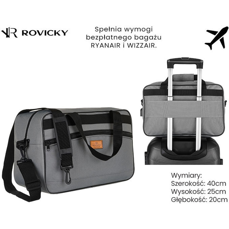 Ľahká a praktická jednodielna cestovná taška od Rovicky, ideálna pre príručnú batožinu Wizzair a Ryanair. Vyrobená z odolného polyesteru v sivej farbe, taška sa hodí ku každému štýlu a spĺňa požiadavky leteckých spoločností na veľkosť bezplatnej príručnej batožiny.