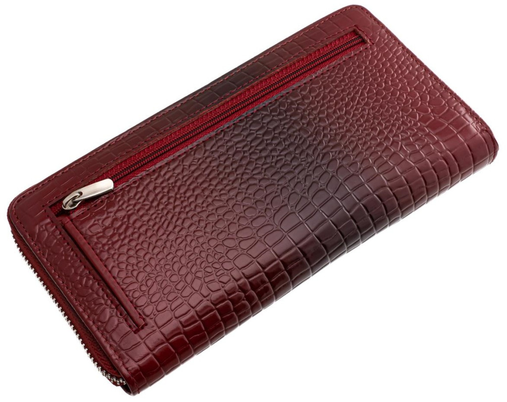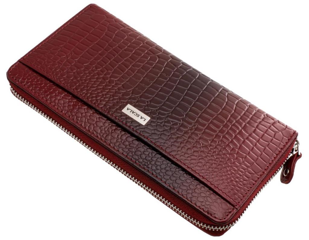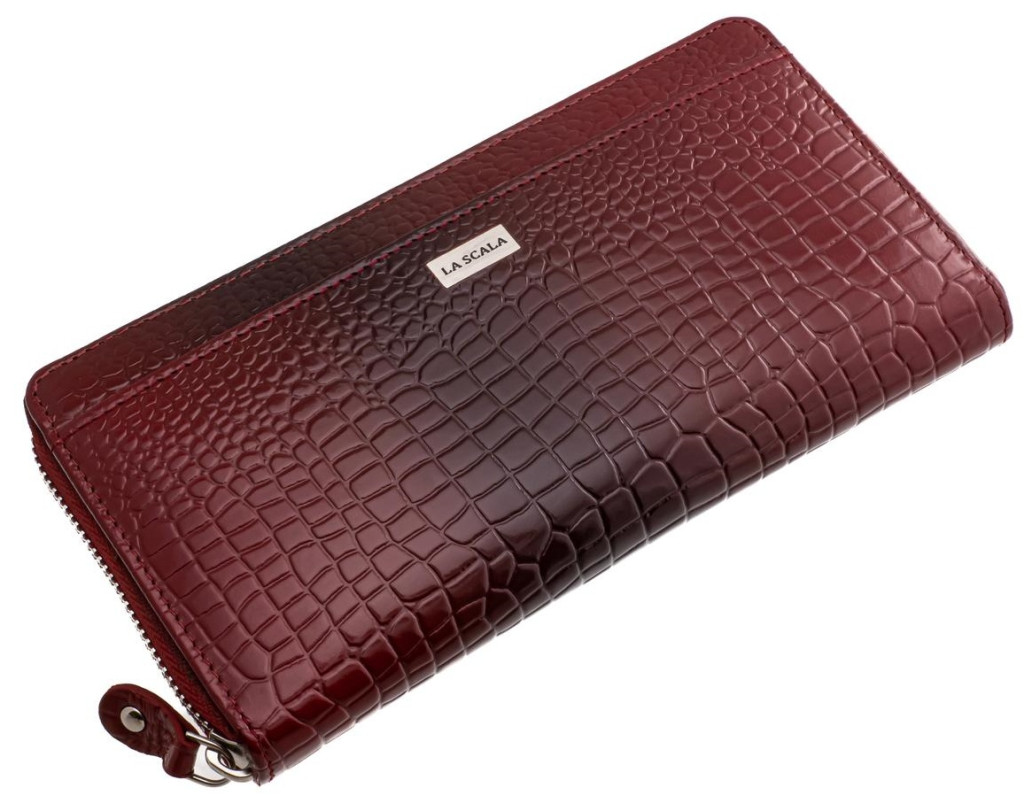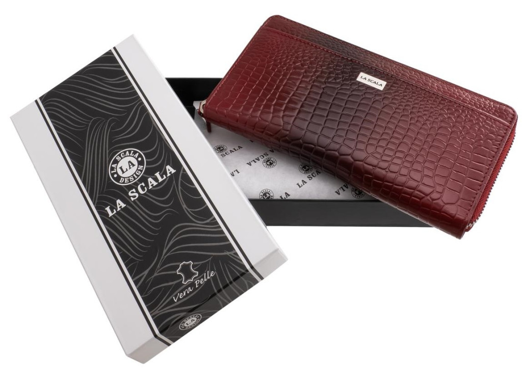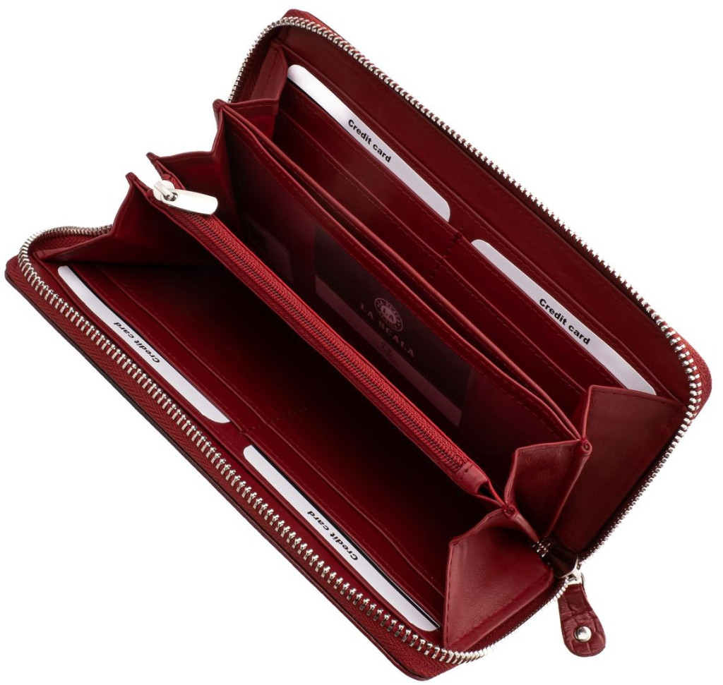 Dámska peňaženka z mäkkej napa kože so zapínaním na zips. Označené La Scala. S dvomi držiakmi na papierové peniaze a dvojdielnym držiakom na drobné, ktorý je uzatvárateľný na zips. Vnútri držiaky kariet a dokumentov, z ktorých jeden je uzatvárateľný na zips.