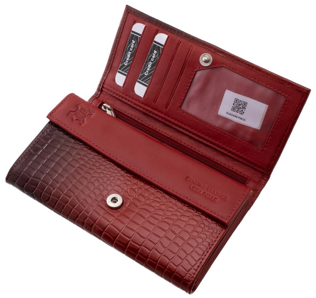 Dámska peňaženka z mäkkej napa kože so zapínaním na zips. Označené La Scala. S dvomi držiakmi na papierové peniaze a dvojdielnym držiakom na drobné, ktorý je uzatvárateľný na zips. Vnútri držiaky kariet a dokumentov, z ktorých jeden je uzatvárateľný na zips.