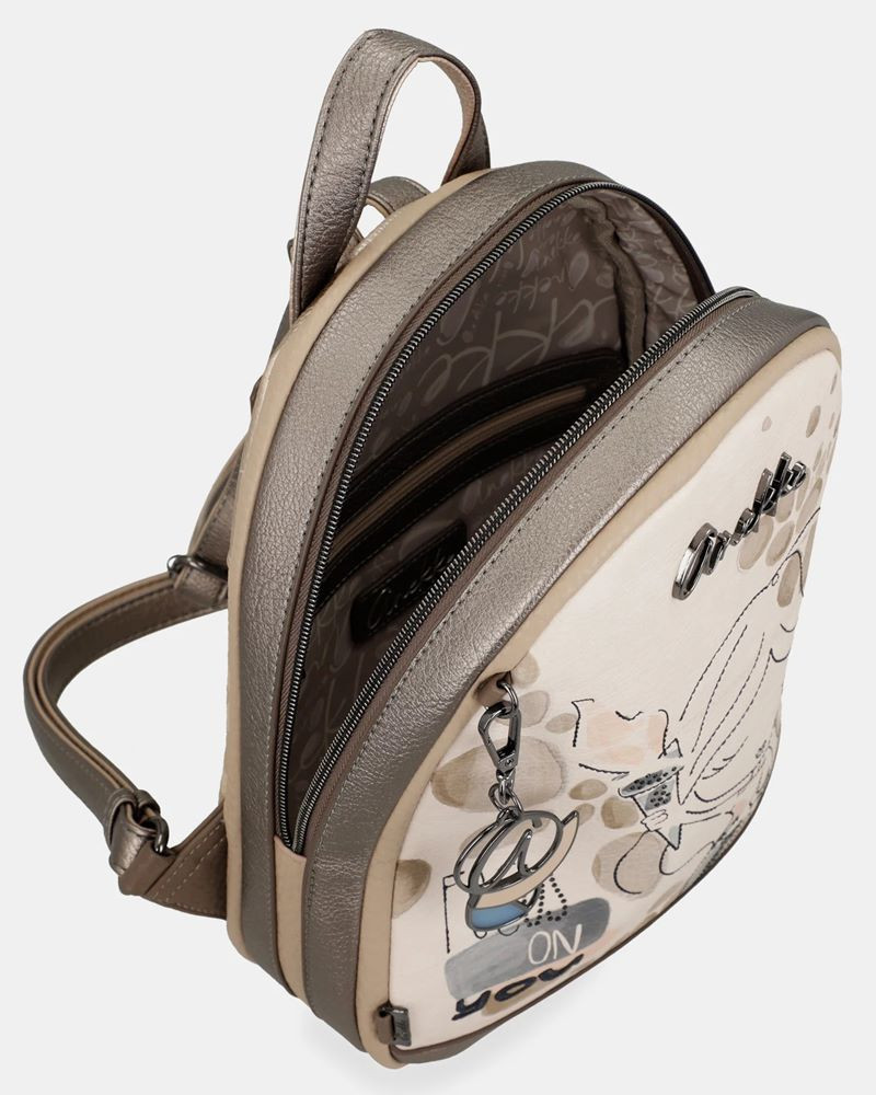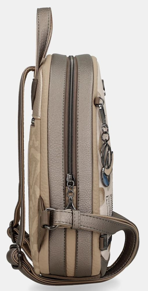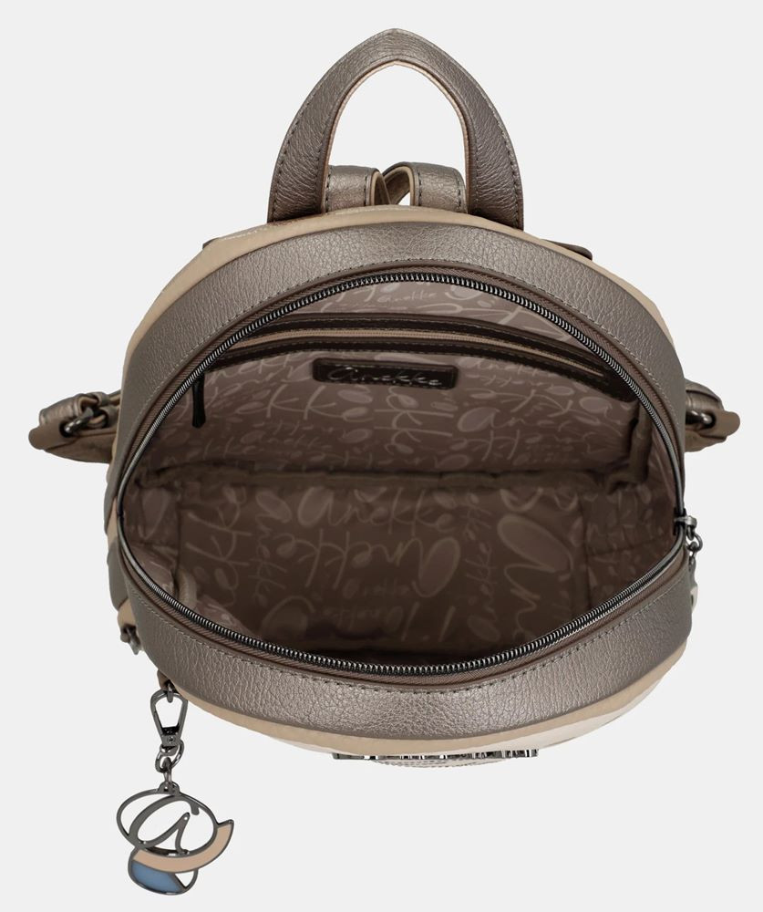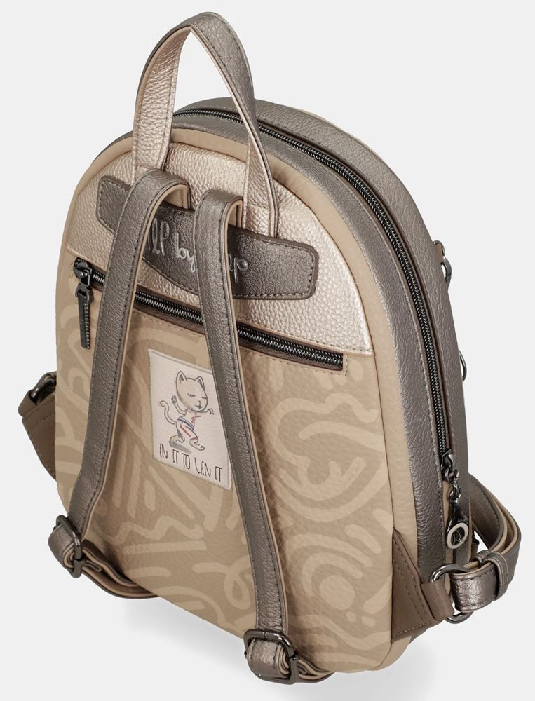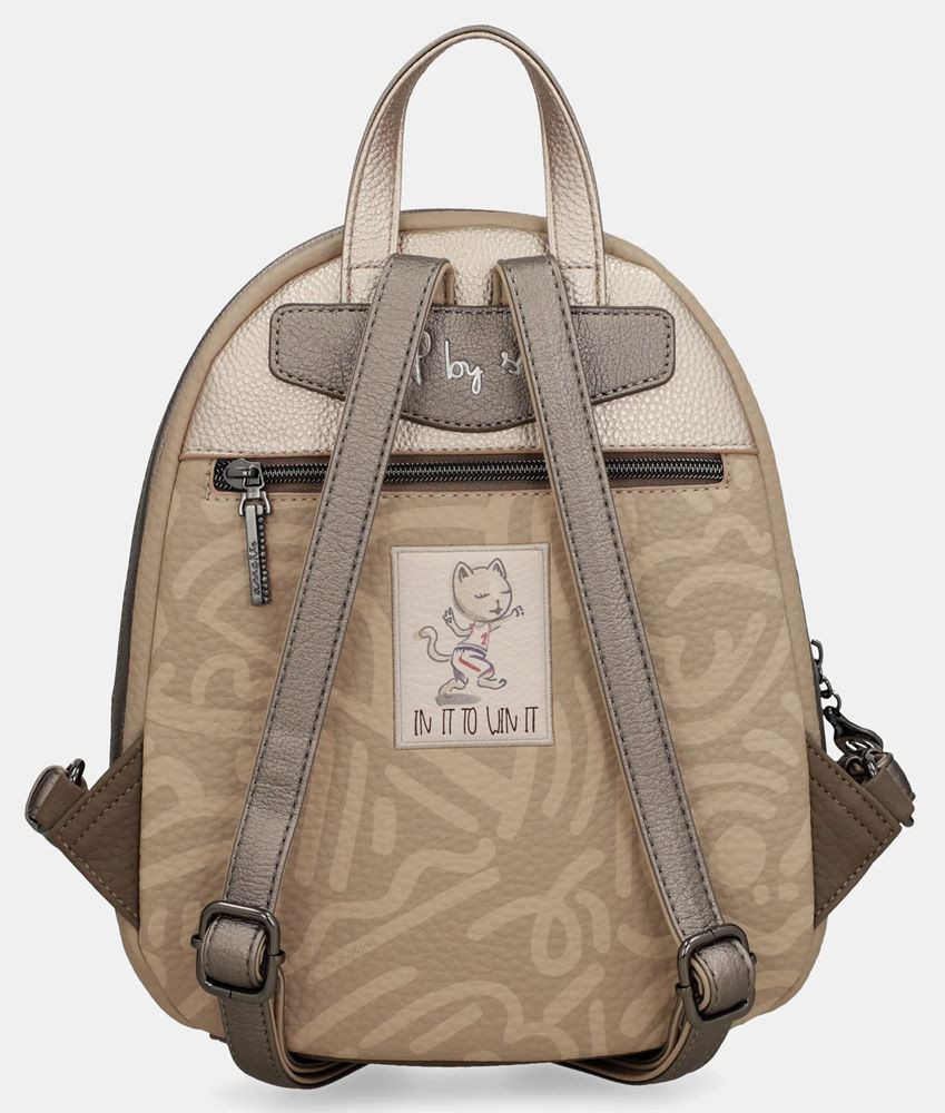 Dámsky batoh Gabol Sahara. Jeho vzhľad odráža eleganciu, rafinovanú sofistikovanosť a má špecifický štýl. Hlavná priehradka je uzatvárateľná na zips. Vnútri je malá priehradka na zips a dve menšie vrecká, z ktorých jedna dokonca pojme náš mobilný telefón. Zadná časť tašky je obohatená o extra vrecko na zips. Popruhy batohu sú ľahko nastaviteľné a jeho rukoväť zaisťuje pohodlné uchopenie.