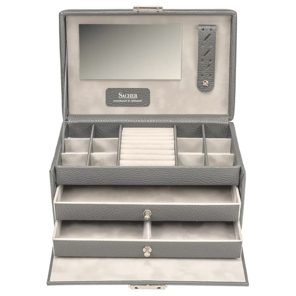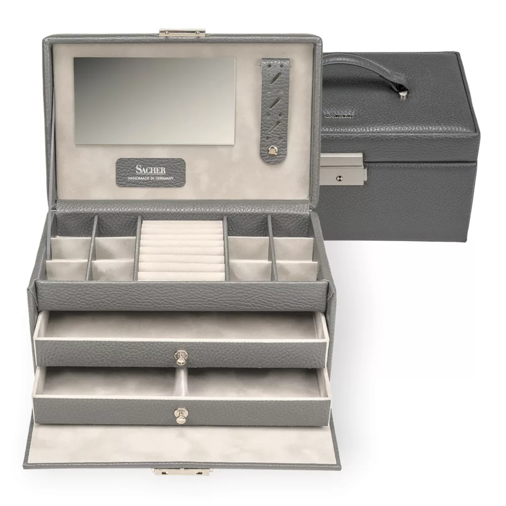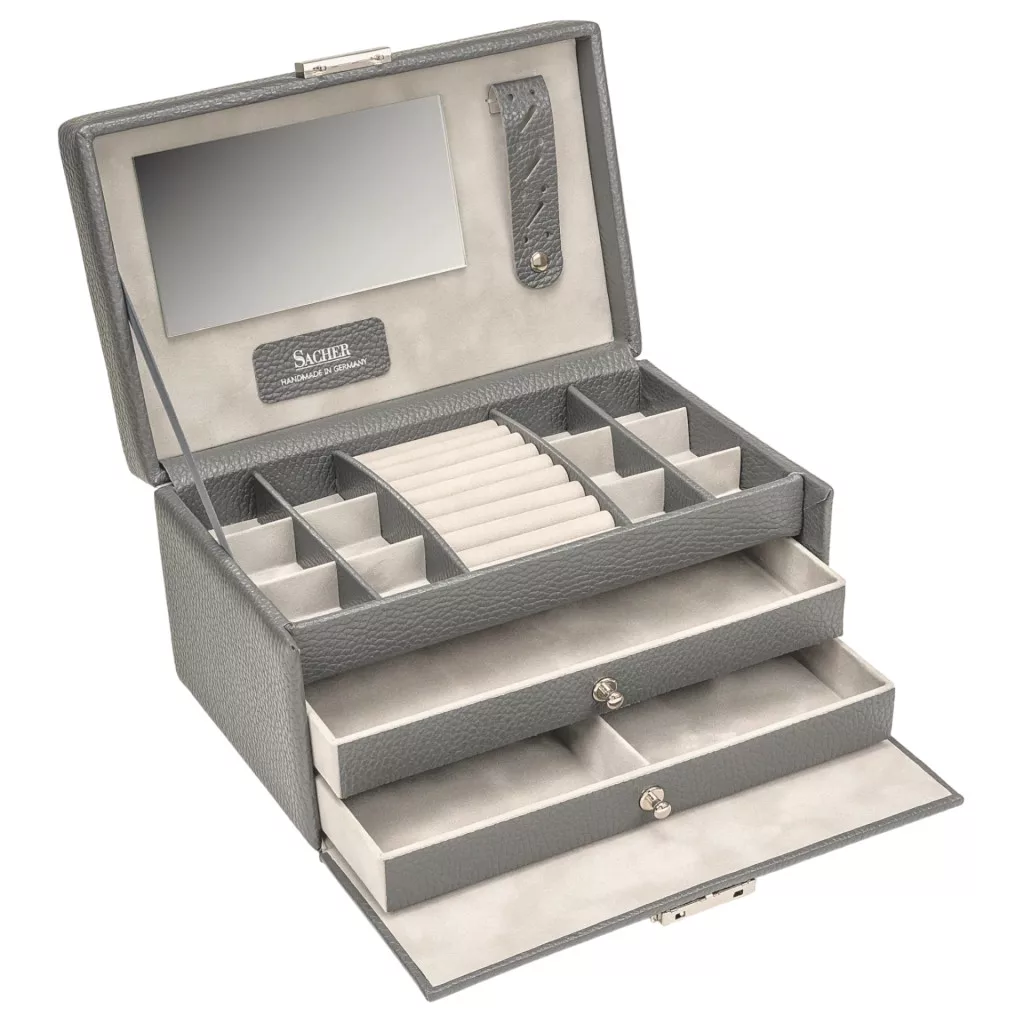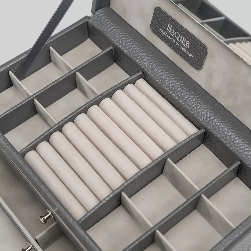 Prepracovaný dizajn, kvalitné materiály, talianska koža , použitie vegánskej kože, ktorá znie ako pravá koža, kovové doplnky a parížsky zamat robí každú šperkovnicu SACHER jedinečnou.
