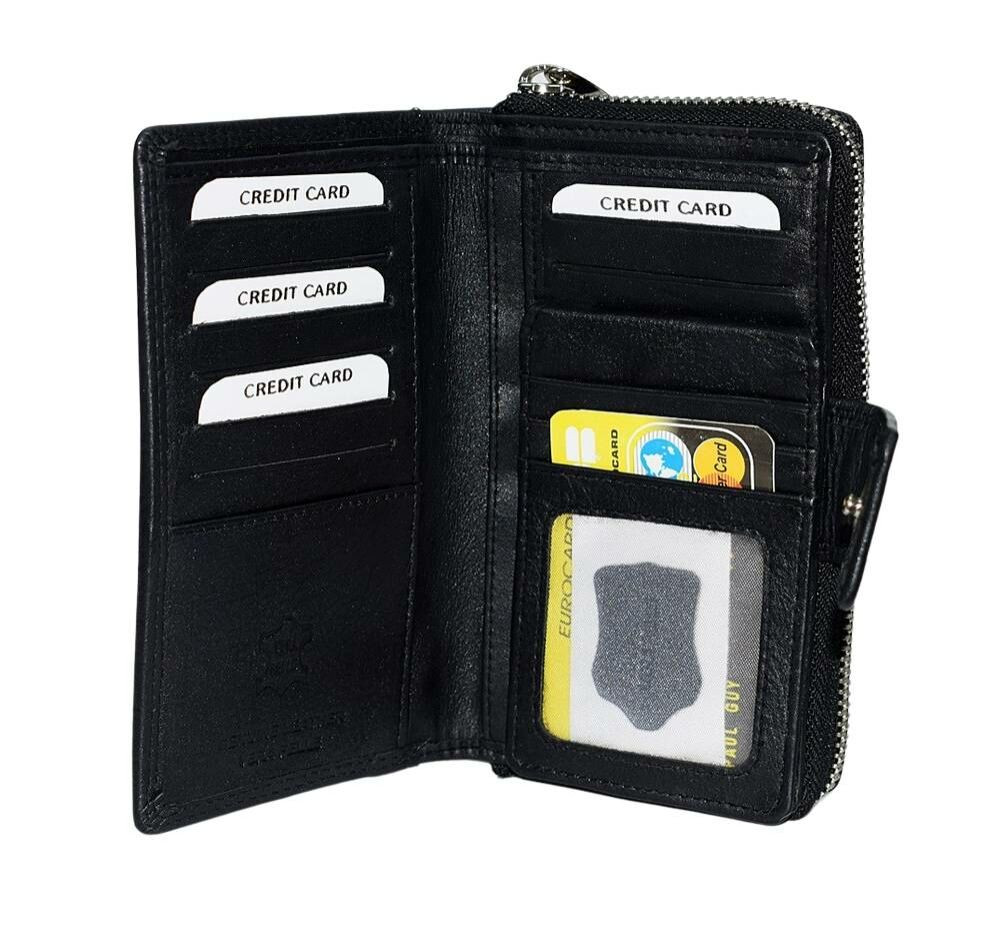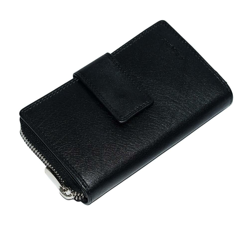 Na prednej strane peňaženky je časť uzatvárateľná na zips, v ktorej je 13 priehradok na karty, 2 vrecká na okná a 4 držiaky na dokumenty. Na zadnej strane je vodorovne prebiehajúce vrecko na zips.