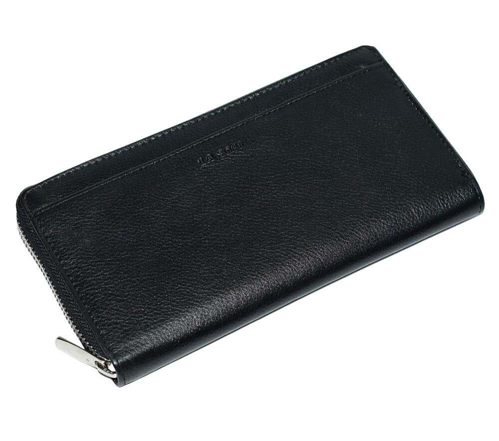 Veľká dámska peňaženka vyrobená z kvalitnej, na dotyk príjemnej odolnej mäkkej kože čiernej farby s nápisom La Scala na vrchnáku.