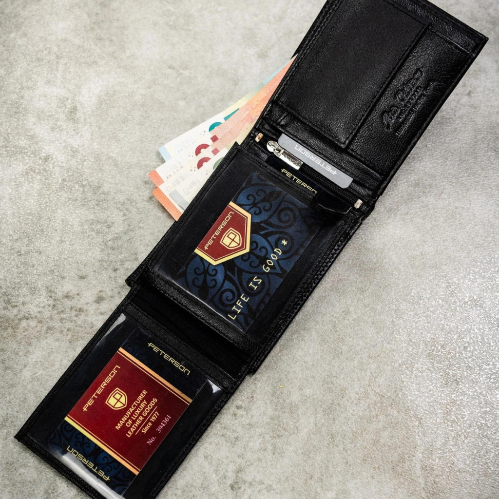 Peňaženka aj opasok sú vyrobené z pravej hovädzej kože. Vonkajší povrch peňaženky sa vyznačuje jemne perforovaným koženým dizajnom s malými bodkami, ktorý dodáva peňaženke moderný, športovo elegantný vzhľad a zároveň je príjemný na dotyk a odolný voči opotrebovaniu. Bočný kožený pás má hladký povrch, ktorý kontrastne zvýrazňuje reliéfne logo značky Peterson. Čierna je nadčasový a všestranný odtieň, ktorý sa hodí k biznis aj ležérnemu štýlu.