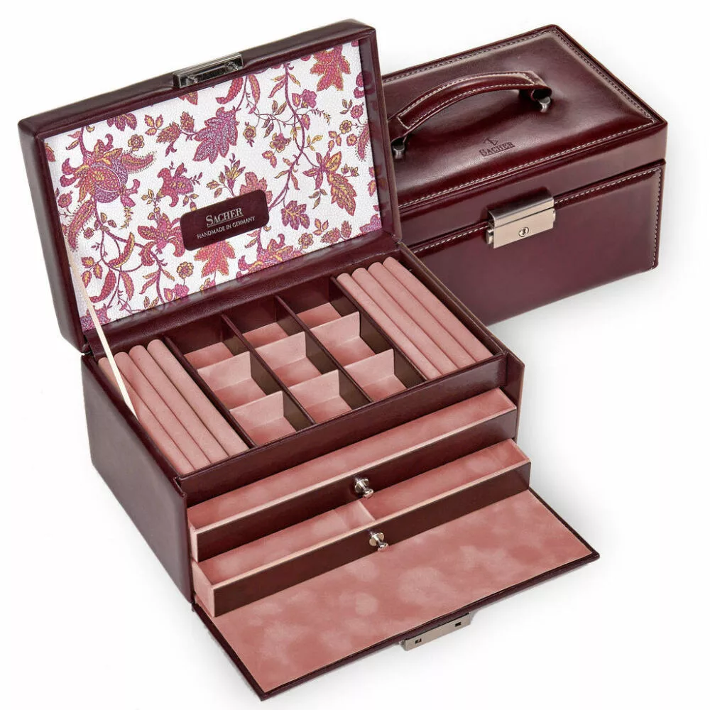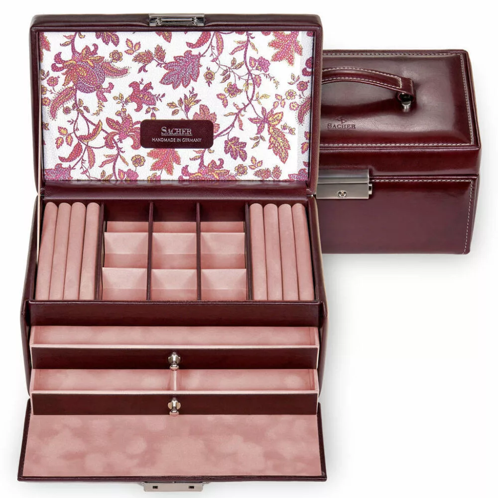 Sacherove šperkovnice Kolekcie Florage sú zdobené kvetinovými vzormi a napriek tomu sú klasicky ladené. Farby šperkovnice sú dokonale zladené, takže môžu byť nielen tým najvhodnejším úložným priestorom pre poklady, ale aj dekoračnými doplnkami nášho domova.