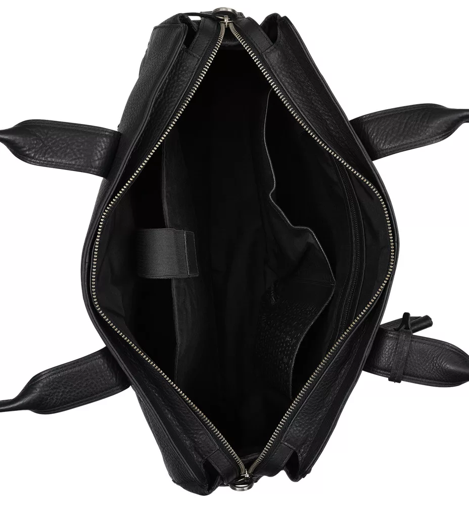 Športovo elegantná, moderná kožená taška na notebook v čistom štýle.