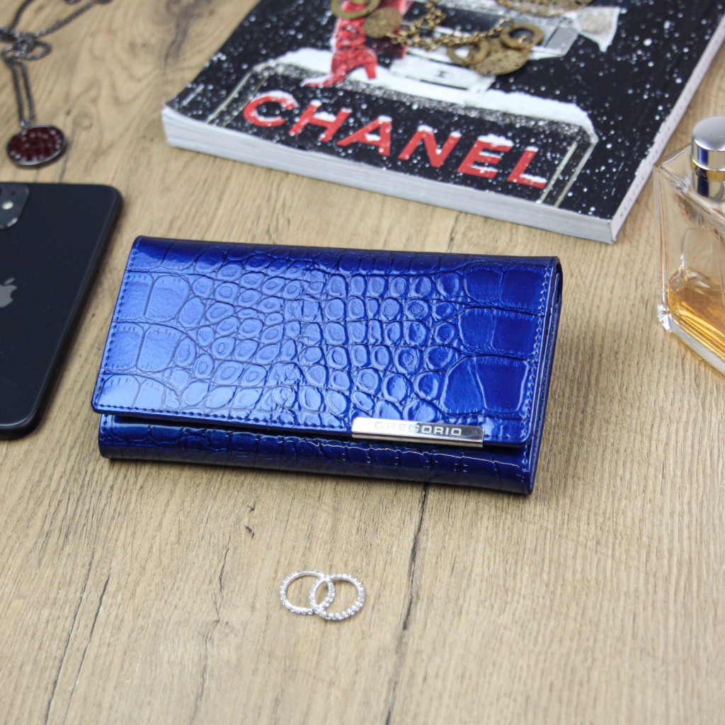 Duży portfel damski, wykonany z najwyższej jakości naturalnej, włoskiej skóry licowej lakierowanej.