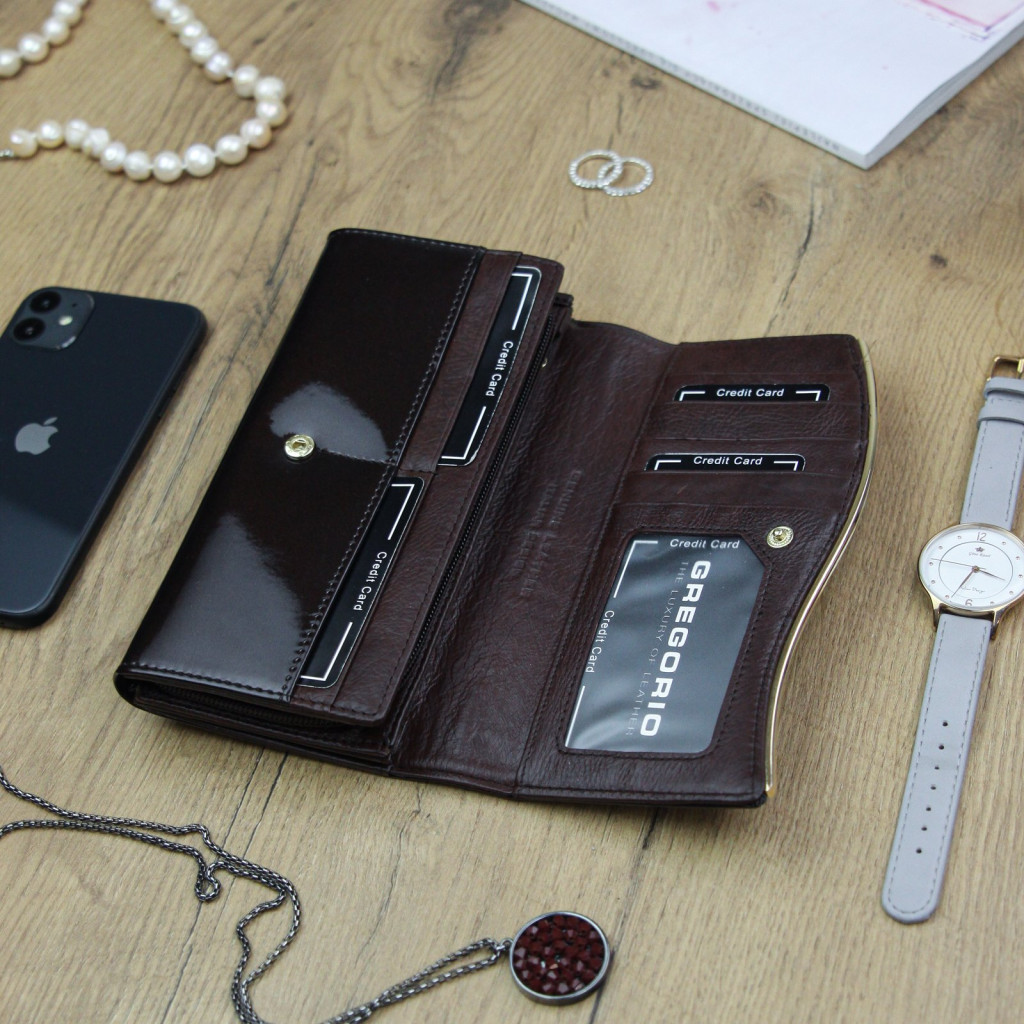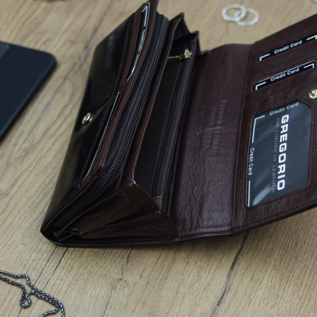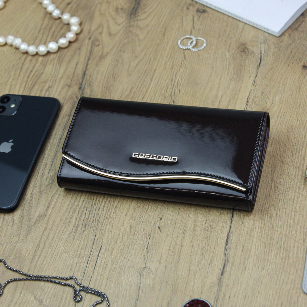 Duży portfel damski, wykonany z najwyższej jakości naturalnej, włoskiej skóry licowej lakierowanej.