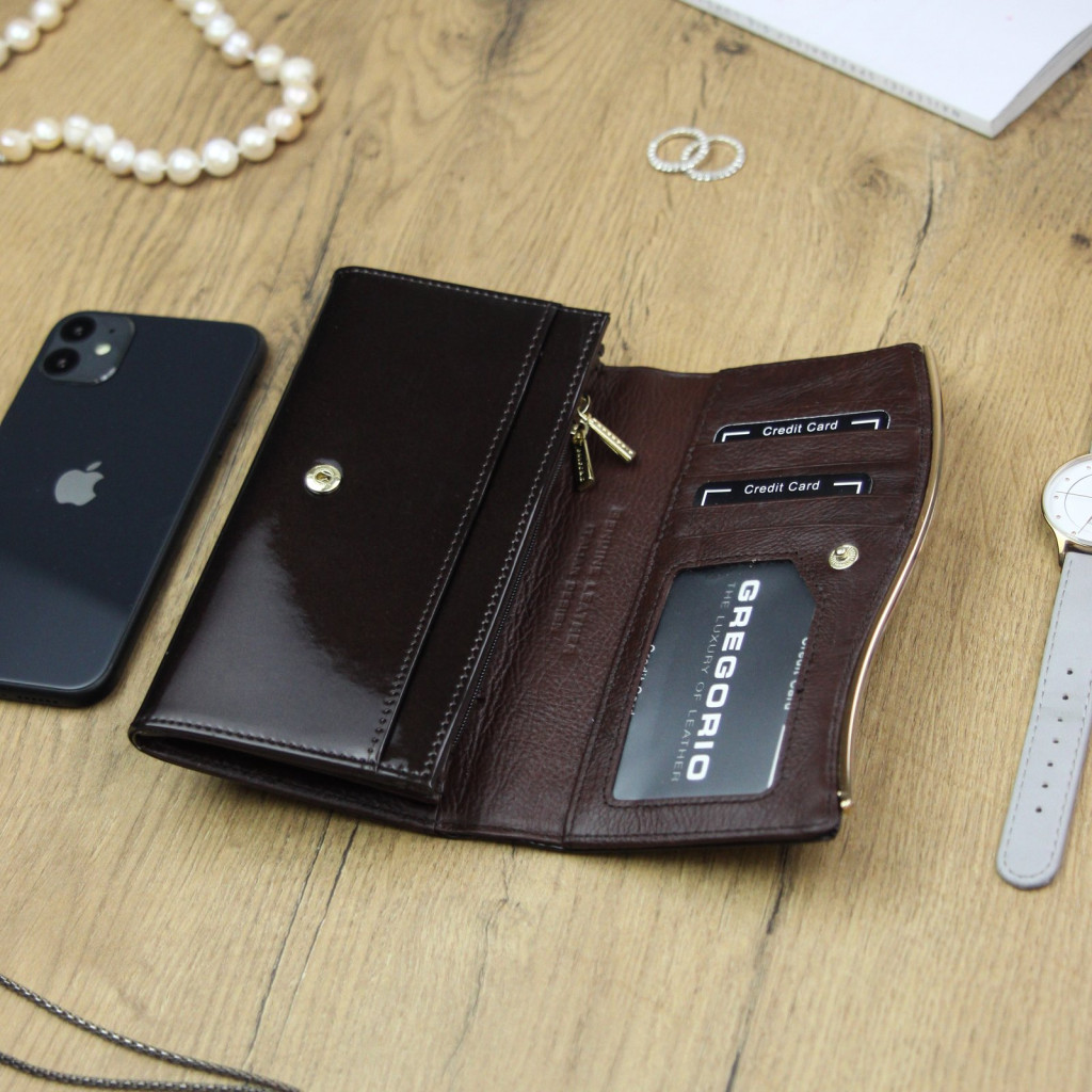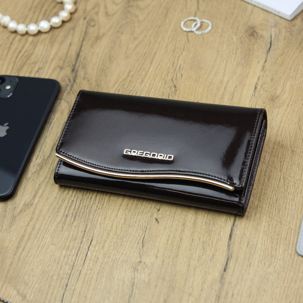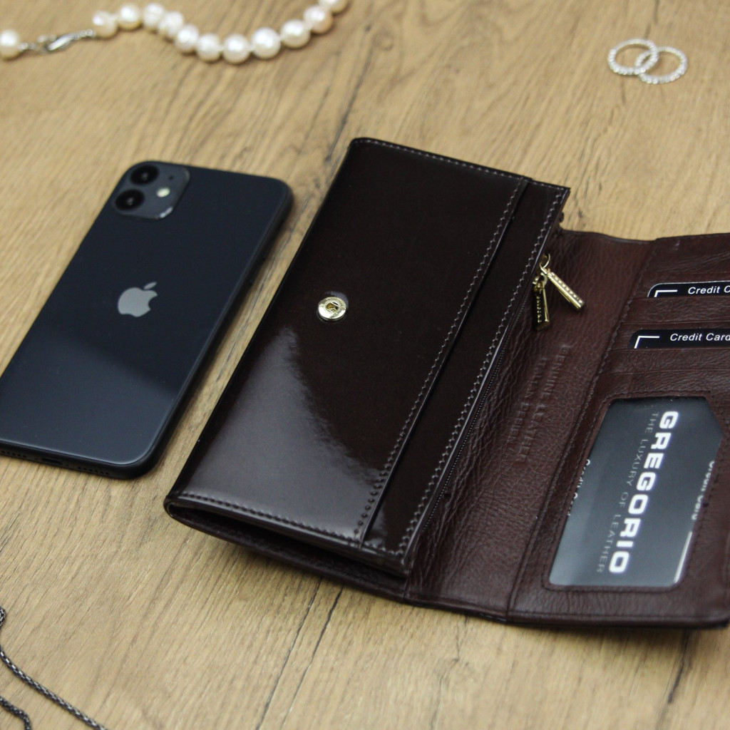 Duży portfel damski, wykonany z najwyższej jakości naturalnej, włoskiej skóry licowej lakierowanej.