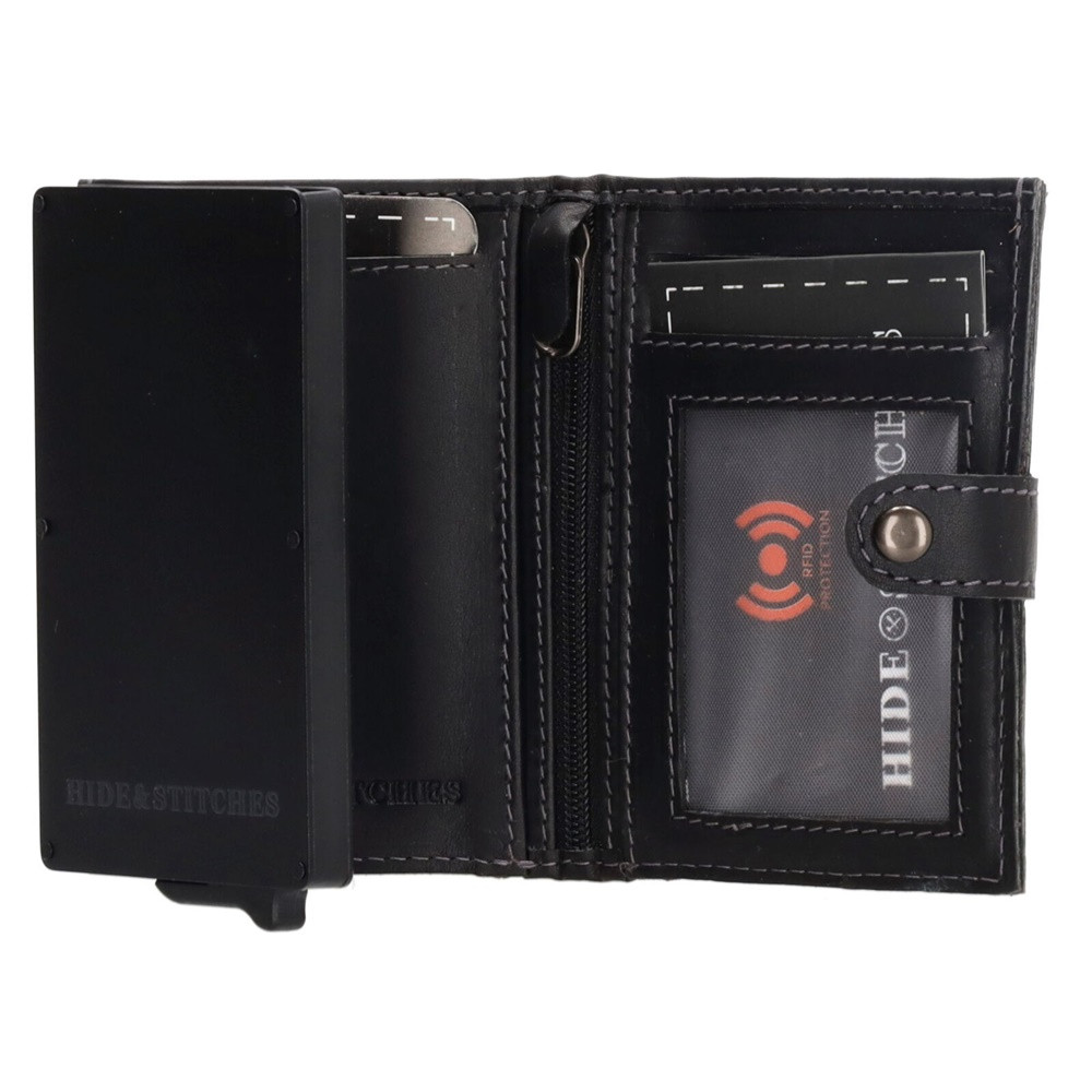 Hide&Stiches čierna kožená vyskakovacia mini peňaženka, držiak na karty 10×7 cm