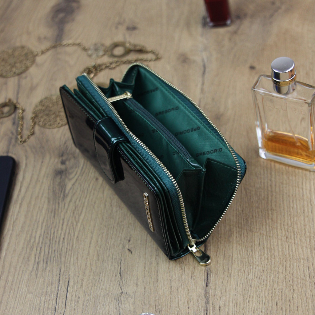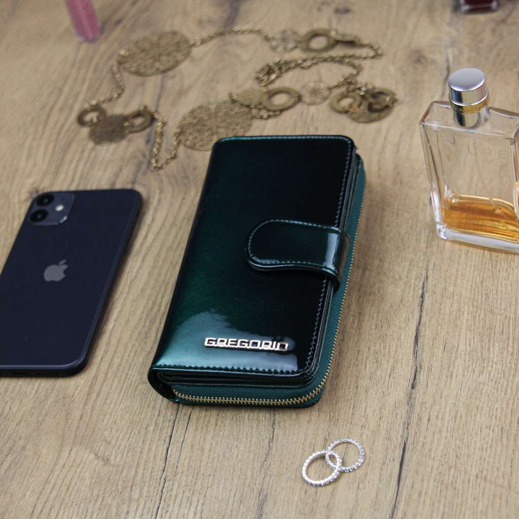Duży portfel damski, wykonany z najwyższej jakości naturalnej, włoskiej skóry licowej lakierowanej, o pięknej, cieniowanej barwie.