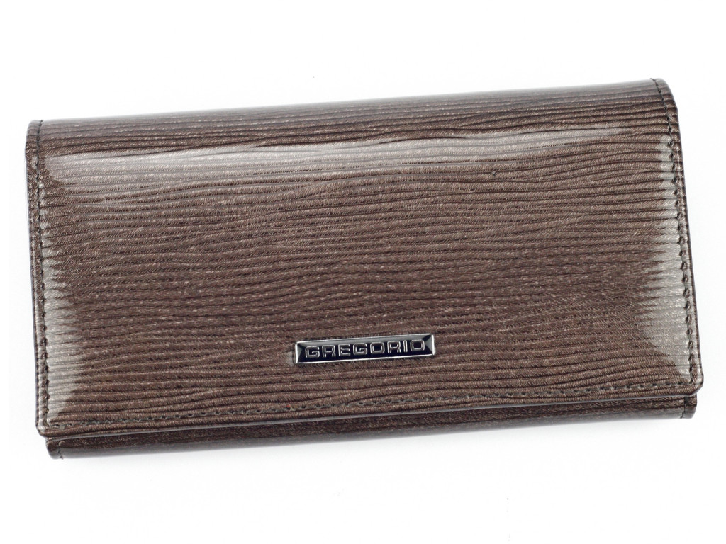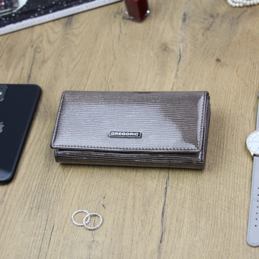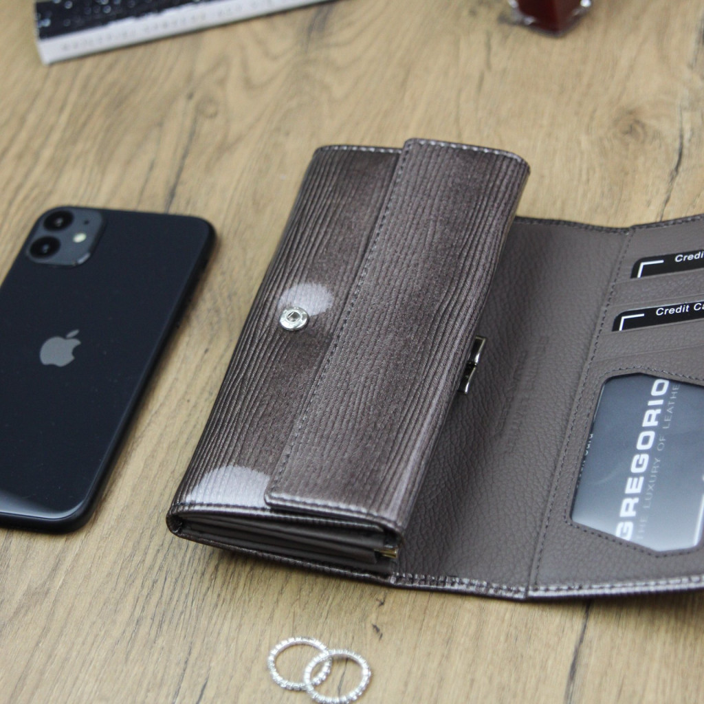 Średniej wielkości portfel damski, wykonany z najwyższej jakości naturalnej, włoskiej skóry licowej lakierowanej, o delikatnym, prążkowanym rysunku.
