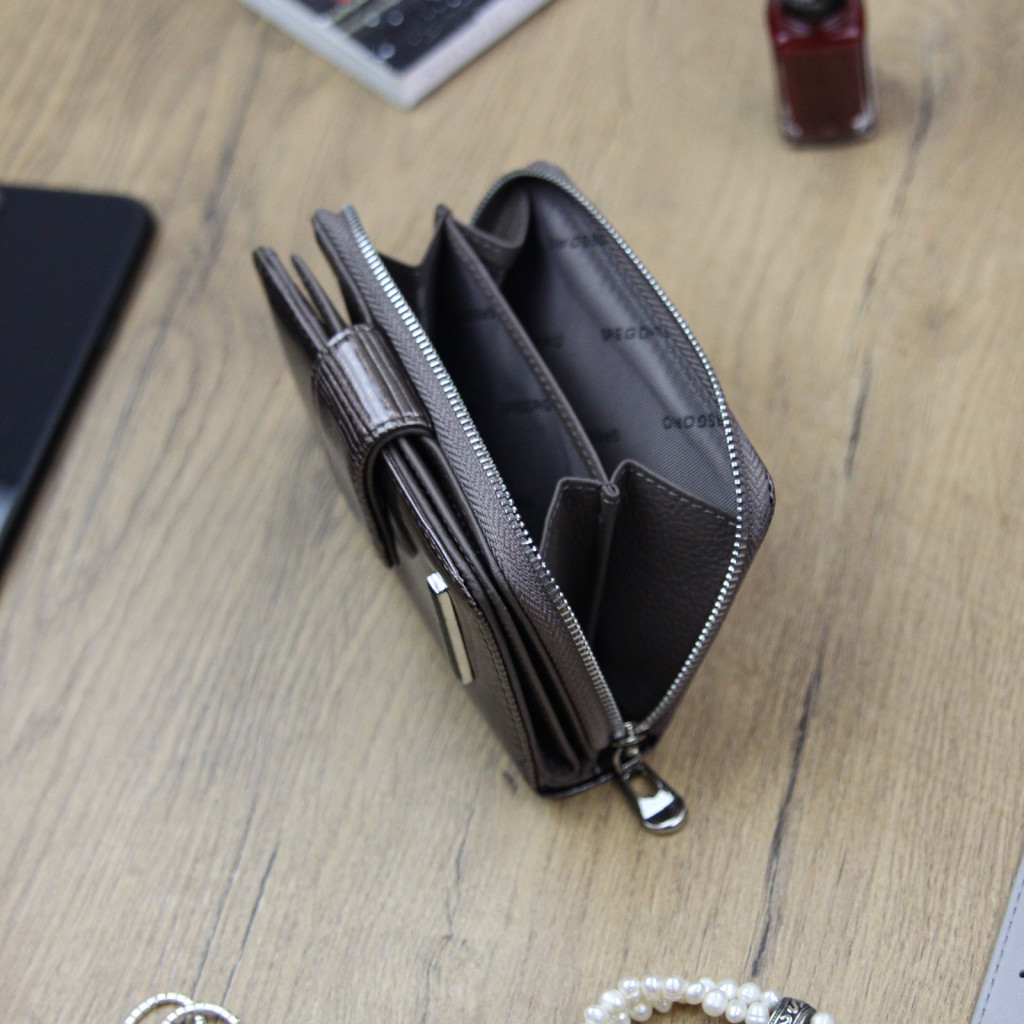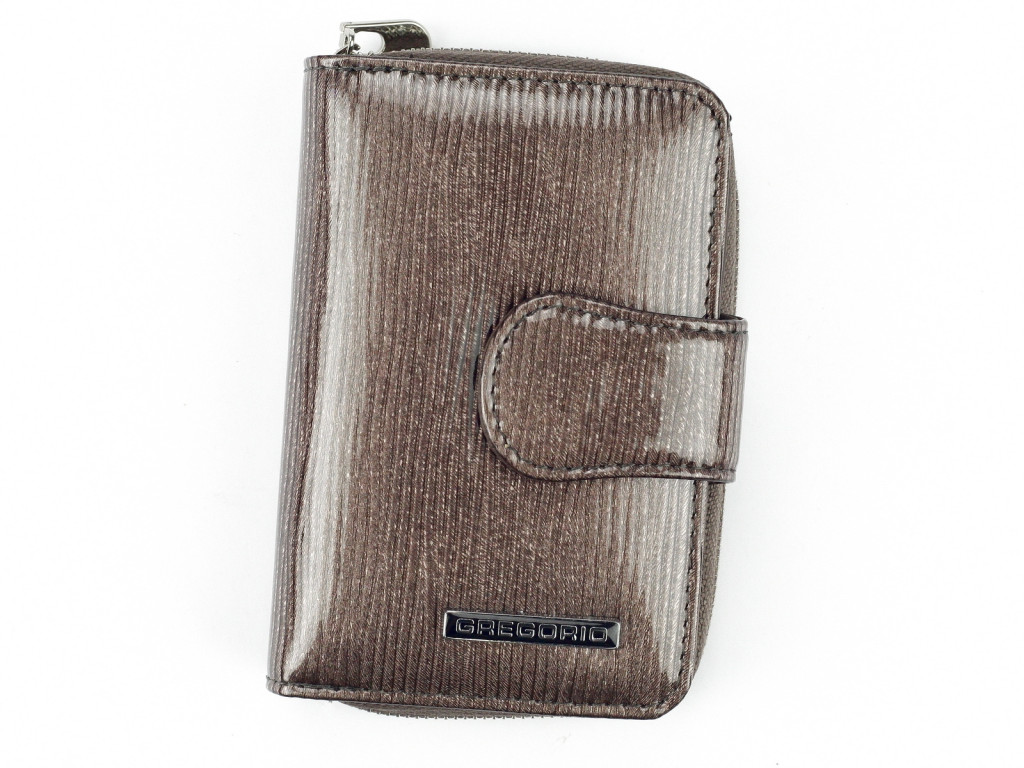 Nieduży portfel damski, wykonany z najwyższej jakości naturalnej, włoskiej skóry licowej lakierowanej, o delikatnym, prążkowanym rysunku.