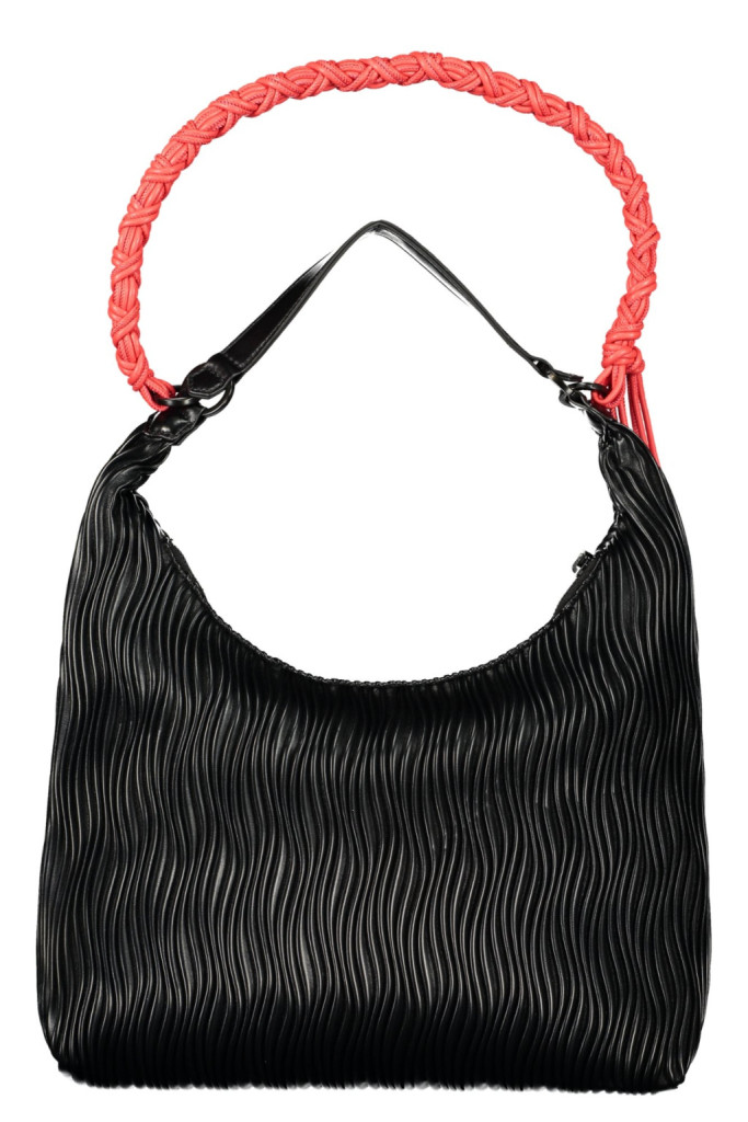 A Desigual fekete női válltáska egy igazán feltűnő, divatos darab, amely a különleges textúrával és élénk részletekkel azonnal magára vonzza a figyelmet. A klasszikus fekete alapot a karakteres, hullámos felület és az élénk, fonott vállpánt teszi egyedivé.