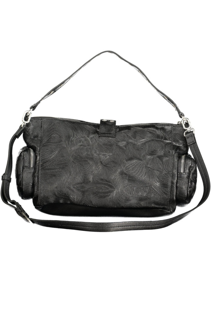 A Desigual fekete válltáska karakteres, vagány megjelenésű darab, amelyet a márkára jellemző részletgazdag kidolgozás és különleges felületi mintázat tesz igazán egyedivé. A fekete alapszínt a dombornyomott, örvénylő növényminta és a hangsúlyos szegecses pánt modern, kissé rockos stílussal egészíti ki.