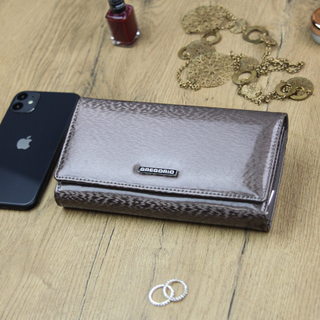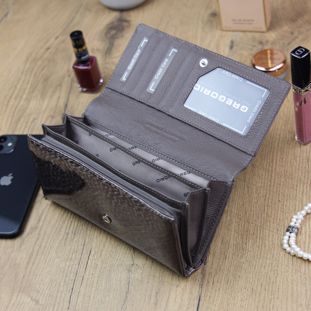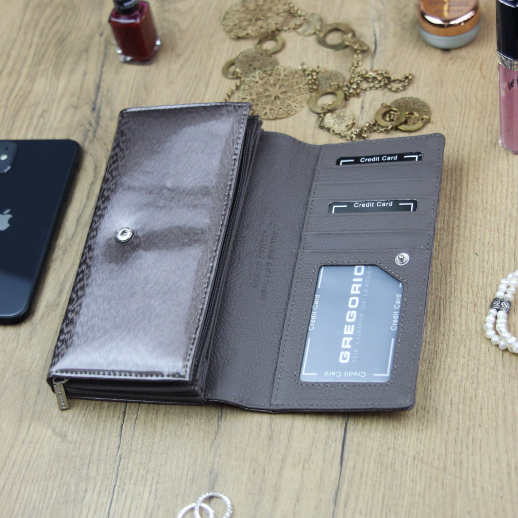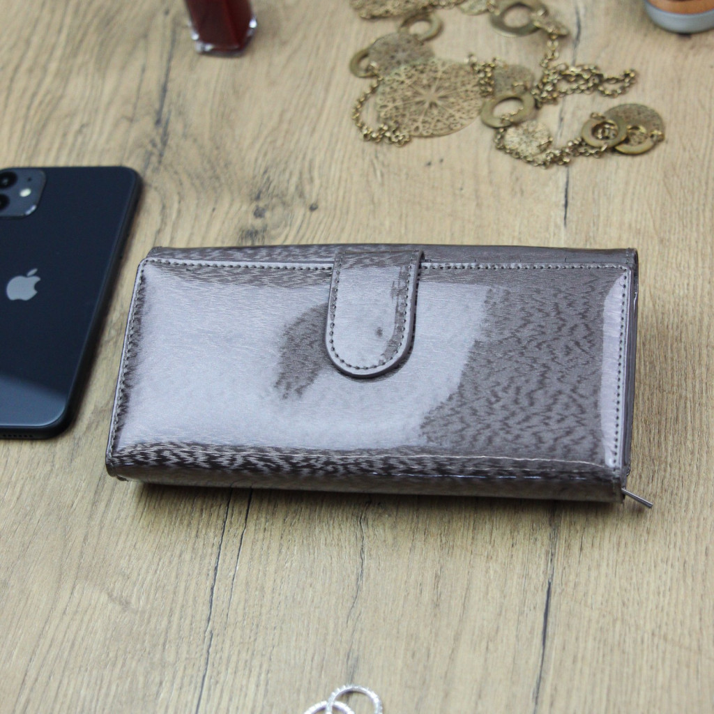 Duży portfel damski, wykonany z najwyższej jakości naturalnej, włoskiej skóry licowej lakierowanej.